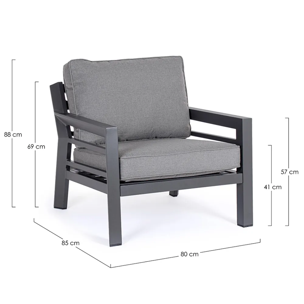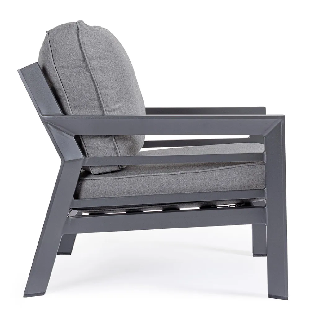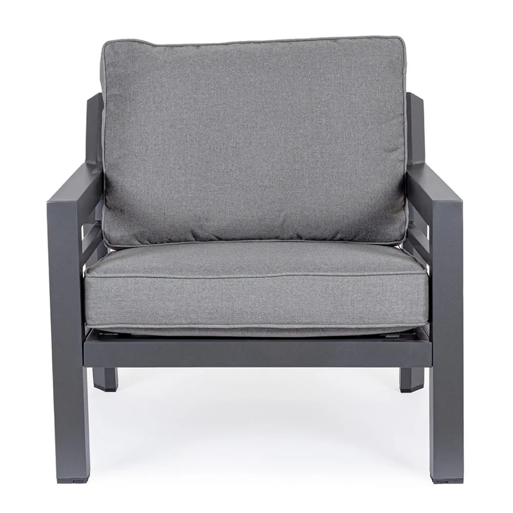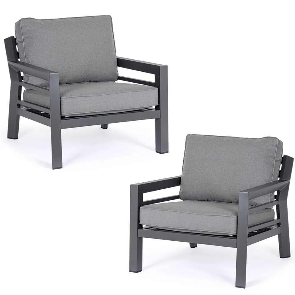 2 Outdoor-Sessel mit anthrazitfarbener pulverbeschichteter Aluminiumstruktur (Polyester), abnehmbaren Kissen aus 100 % Polyestergewebe und verstellbaren Füßen.