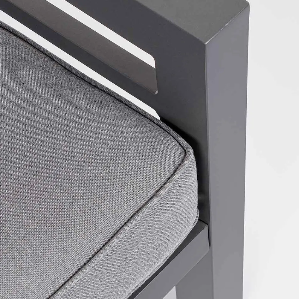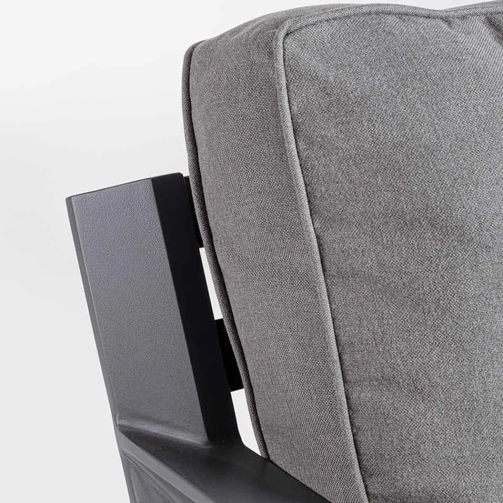Dieser Gartensessel ist der Inbegriff moderner Eleganz und höchsten Komforts . Seine robuste Metallstruktur, die in einem edlen Mattschwarz lackiert ist, bietet einen auffälligen Kontrast zu den weichen grauen Stoffkissen und lädt zu Momenten unvergleichlicher Entspannung unter freiem Himmel ein. Das Design ist bewusst schlicht gehalten , mit klaren Linien und einer Architektur, die die Essenz des zeitgenössischen minimalistischen Stils einfängt.