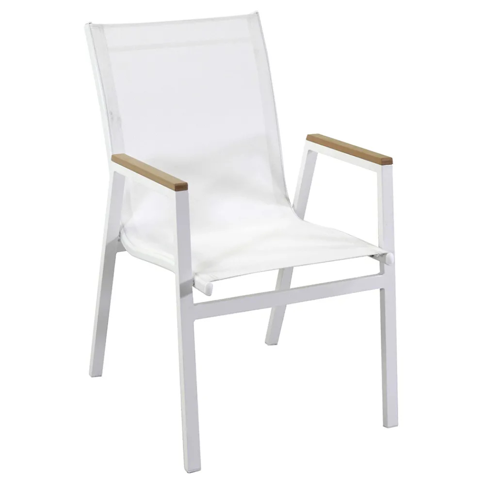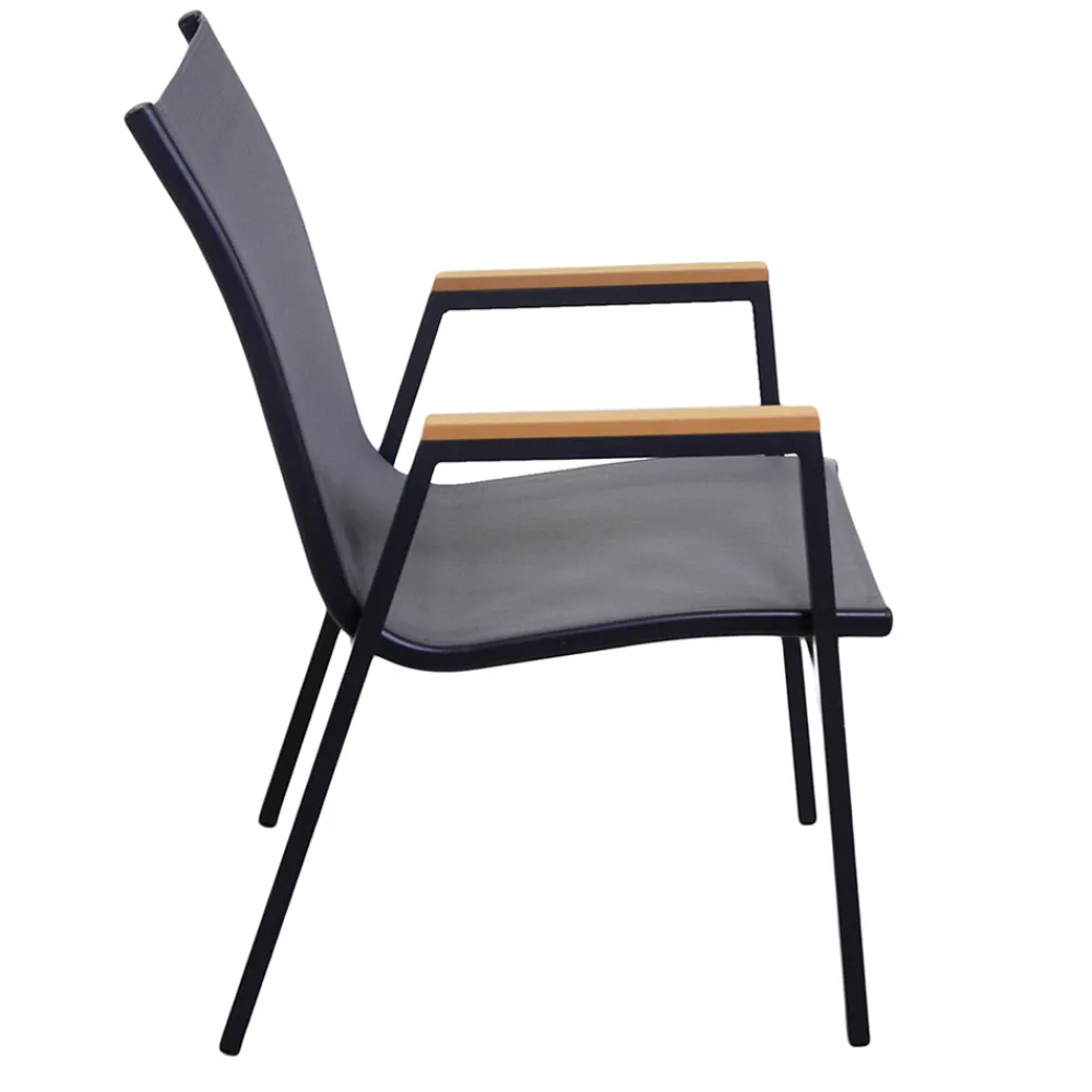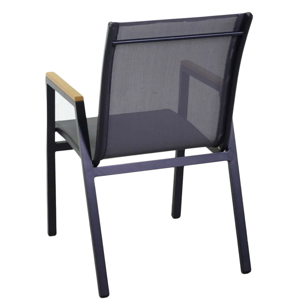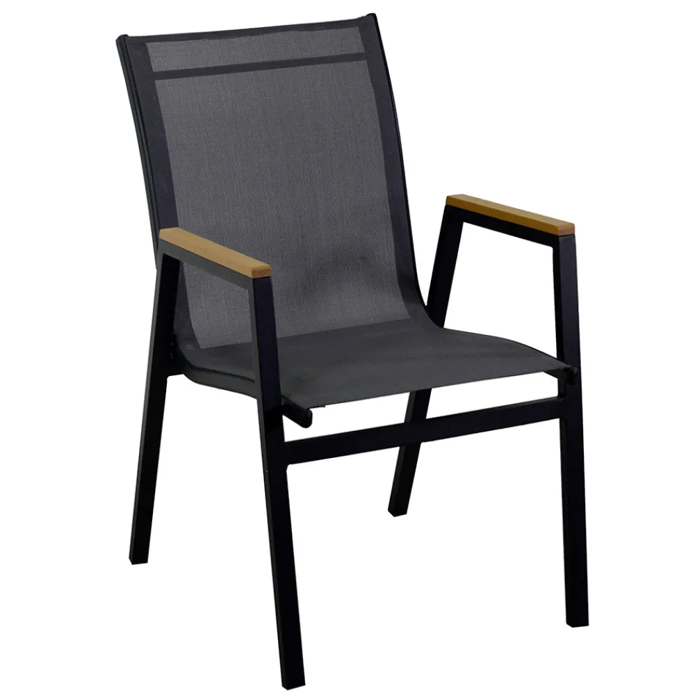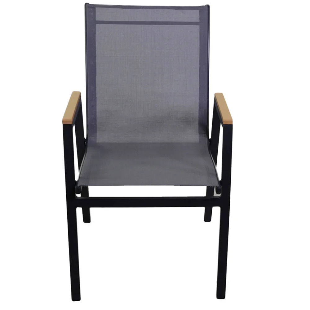 Dieser pulverbeschichtete Aluminiumrahmen Sessel vereint Stil und Funktionalität und ist die perfekte Ergänzung für jeden modernen Outdoor-Bereich. Das Textilene-Gewebe sorgt für Wetterbeständigkeit und lang anhaltenden Komfort, während die Holzeinsätze an den Armlehnen einen Hauch von Wärme und Eleganz verleihen.