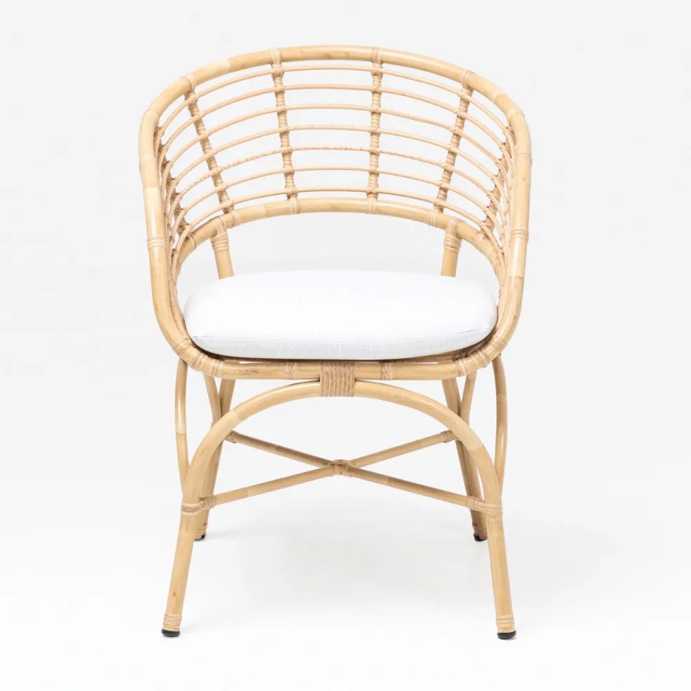 Outdoor-Sessel mit einem Aluminiumrahmen und HQ-Polyrattan-Geflecht in natürlicher Optik, Sitzfläche mit Kissen aus cremefarbenem Outdoor-Olefin-Gewebe.