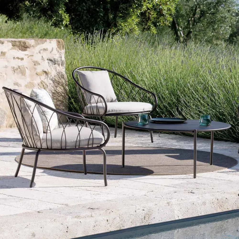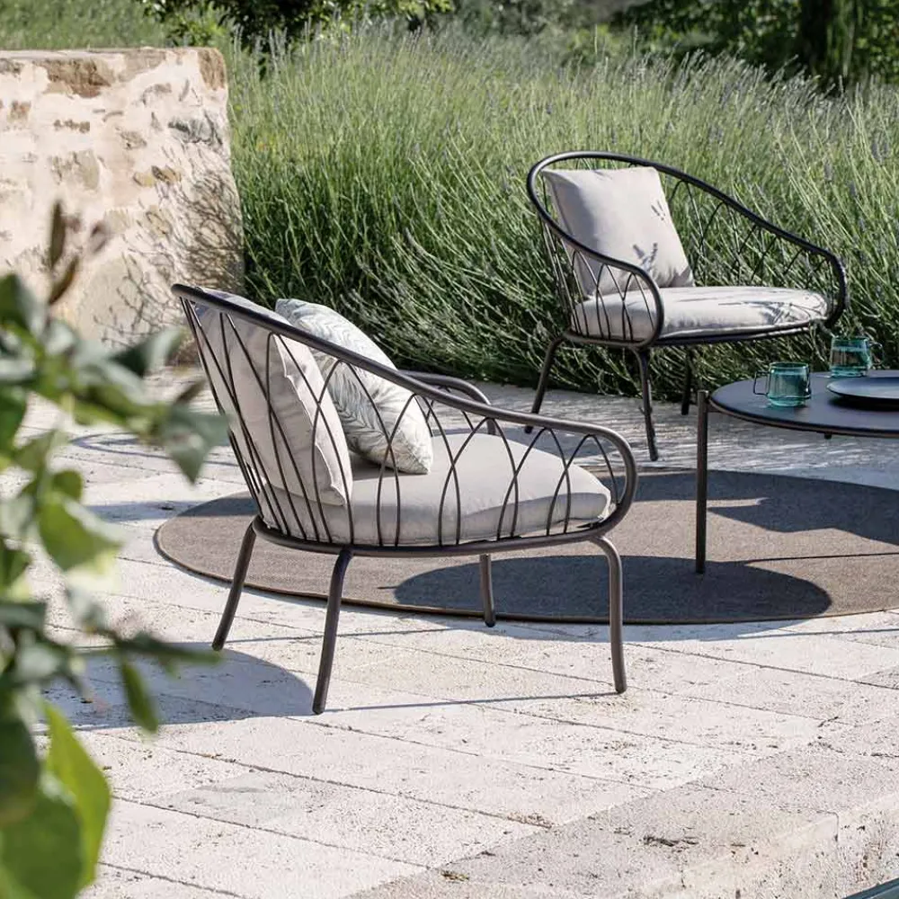Niedriger Gartensessel mit pulverbeschichteter verzinkter Eisenstruktur und Stoffsitz Made in Italy