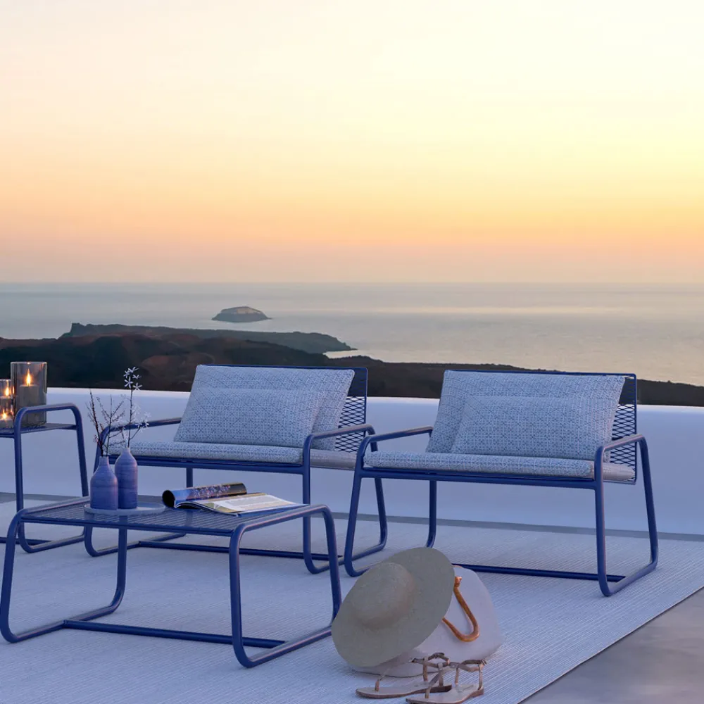 Outdoor-Sessel aus Metall mit aufeinander abgestimmten Stoffkissen, hochwertige Made in Italy.