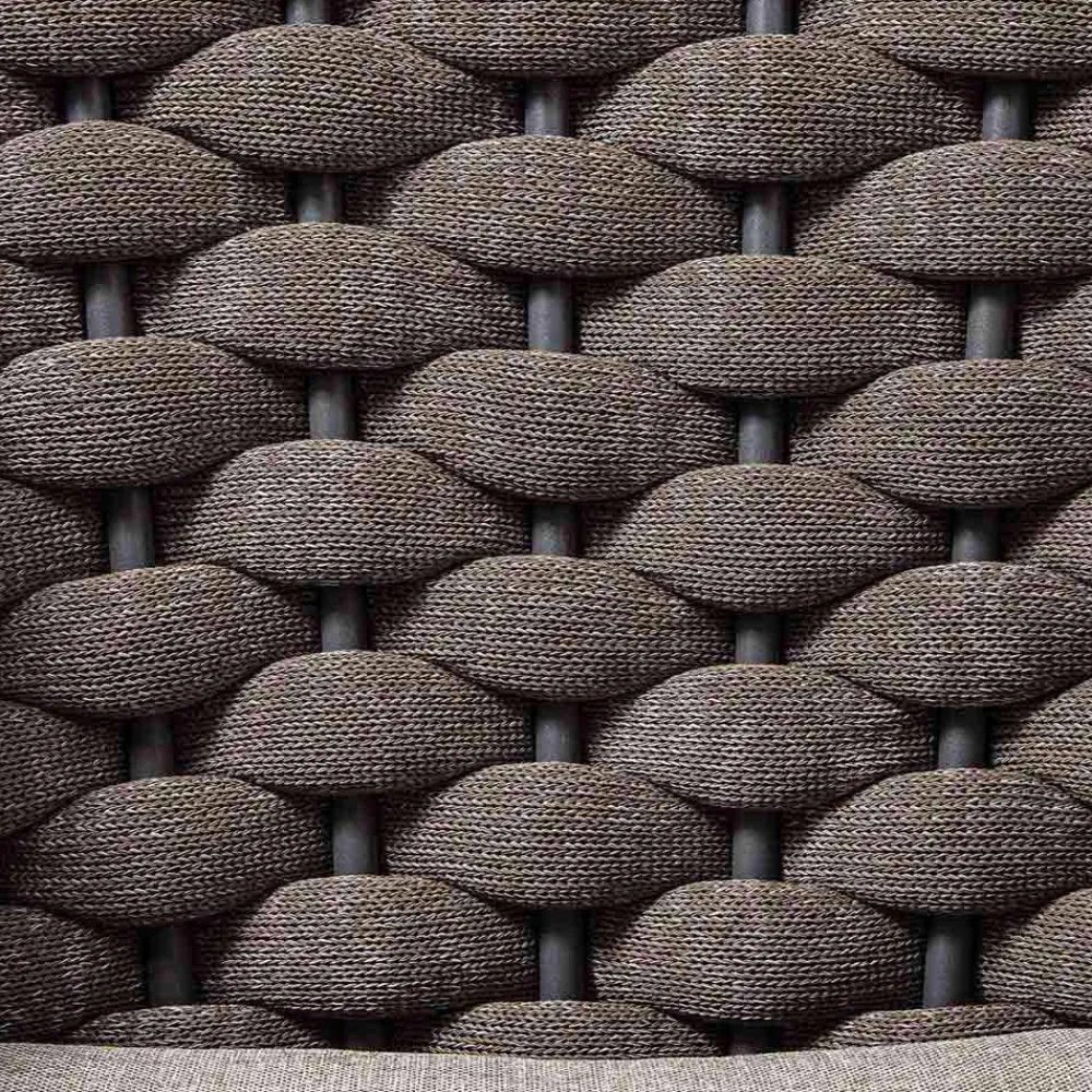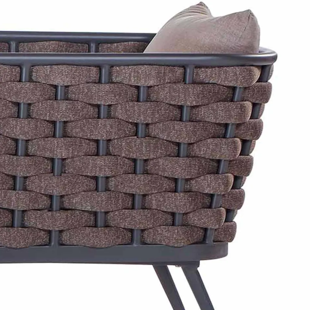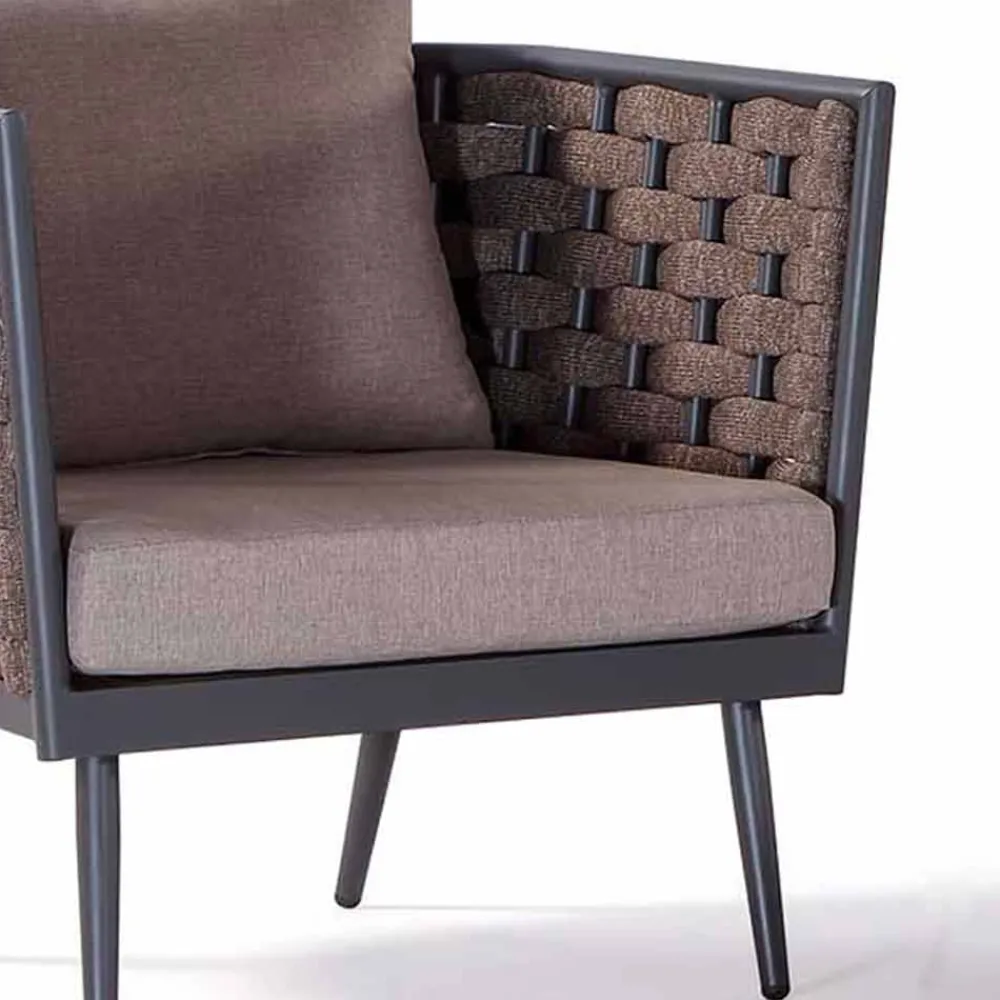 Outdoor-Sessel mit graphitbeschichteter Aluminiumstruktur und Polyesterseilbindung mit Sitz- und Rückenkissen aus braunem Acrylgewebe . Ein Sitz für Außenumgebungen, der Funktionalität und ein angenehmes ästhetisches Erscheinungsbild kombiniert und somit eine perfekte Einrichtungslösung für diejenigen bietet, die ein Produkt suchen, das ebenso komfortabel und einladend wie elegant ist und eine wunderbare Harmonie mit den anderen Elementen von schafft die Möbel umgeben.