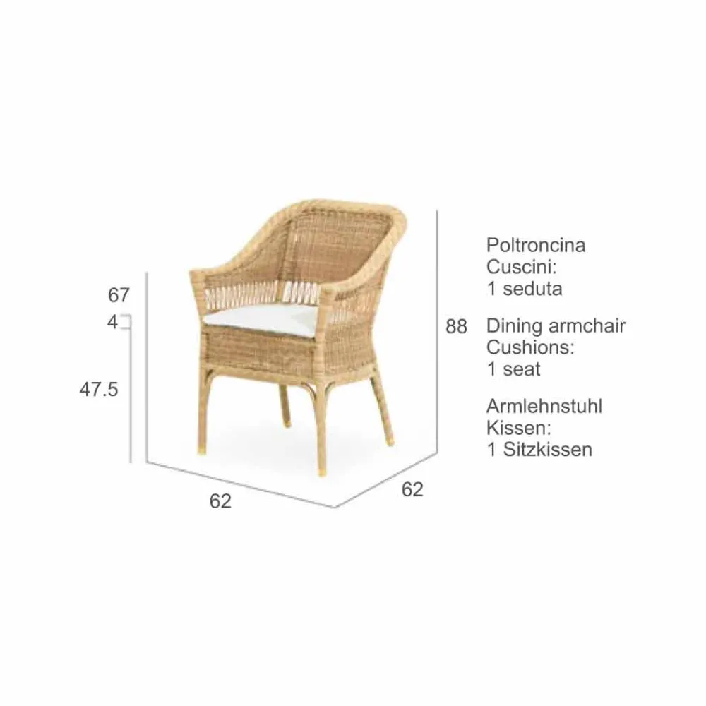 | Maße | L.62 cm x P.62 cm x 88 cm x H. tot h. Session 47.5 + 4 cm x 67 cm h.bracciolo |