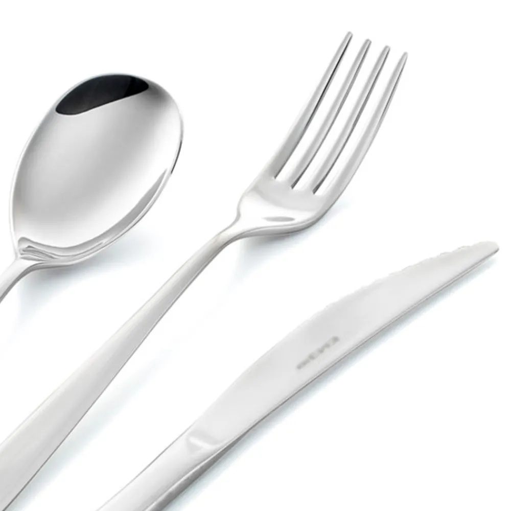 Komplettes Besteck aus poliertem Edelstahl mit weichen Linien, 24-teilig made in Italy.