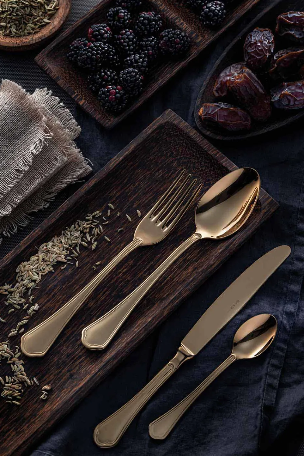 PVD ist die Abkürzung für Physical Vapour Deposition, eine Technologie zum Färben von Stahl in speziellen Vakuumkammern, in denen sehr dünne Metallfilme mit Dampf besprüht werden, die auf dem Besteck kondensieren. Diese Behandlung mit einer Reihe wundervoller Farbtöne verschönert das Besteck nicht nur, sondern macht es auch widerstandsfähiger gegen Verschleiß und Kratzer und ist eine perfekt nachhaltige Beschichtung, die für die Verwendung in Lebensmitteln geeignet ist.