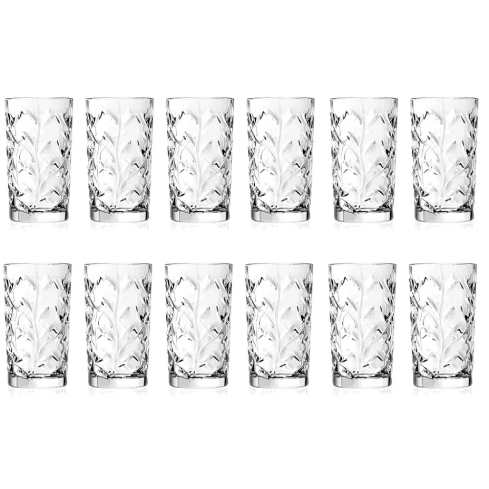 Hohe Trinkgläser aus Öko-Kristall mit Blattdekor, 12 Stück made in Italy.