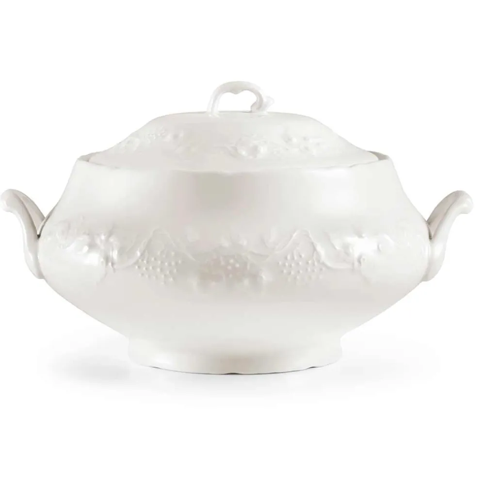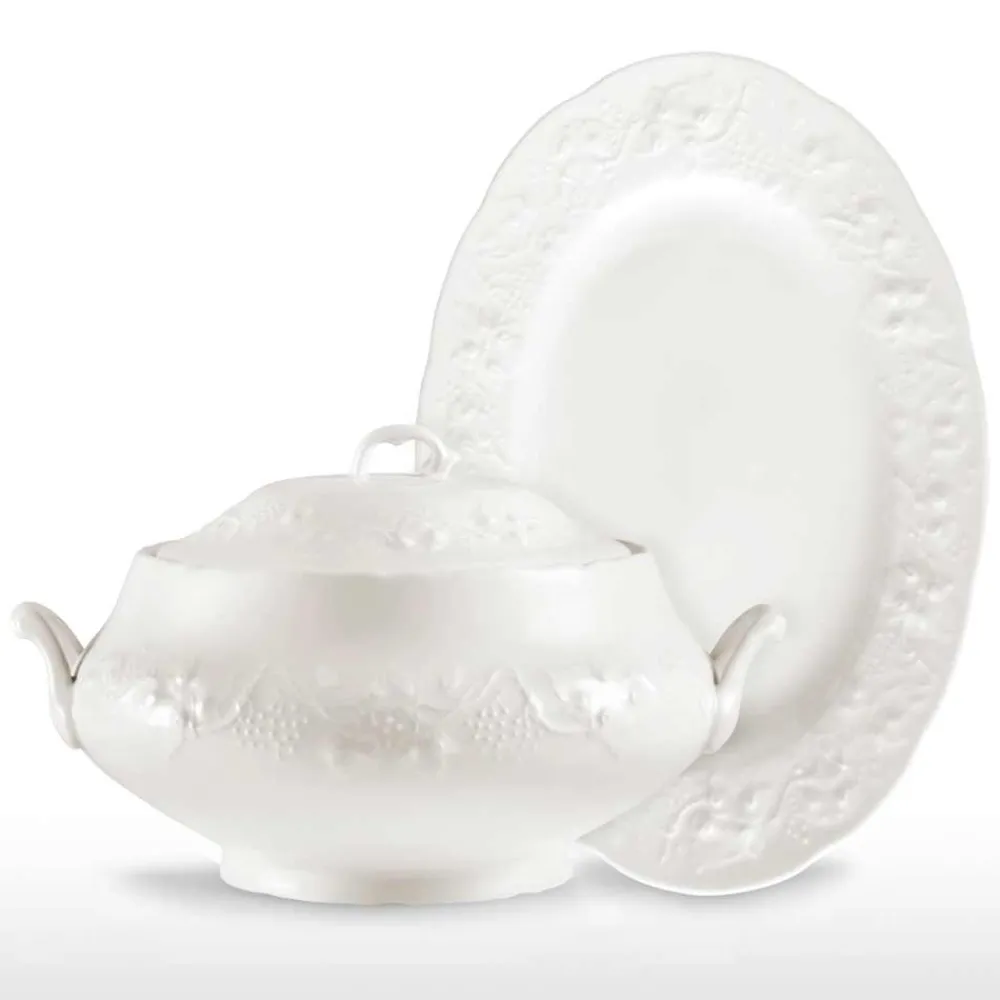 Große elegante und raffinierte Suppenterrine und ovales Serviertablett aus weißem Porzellan, 2 Stück.