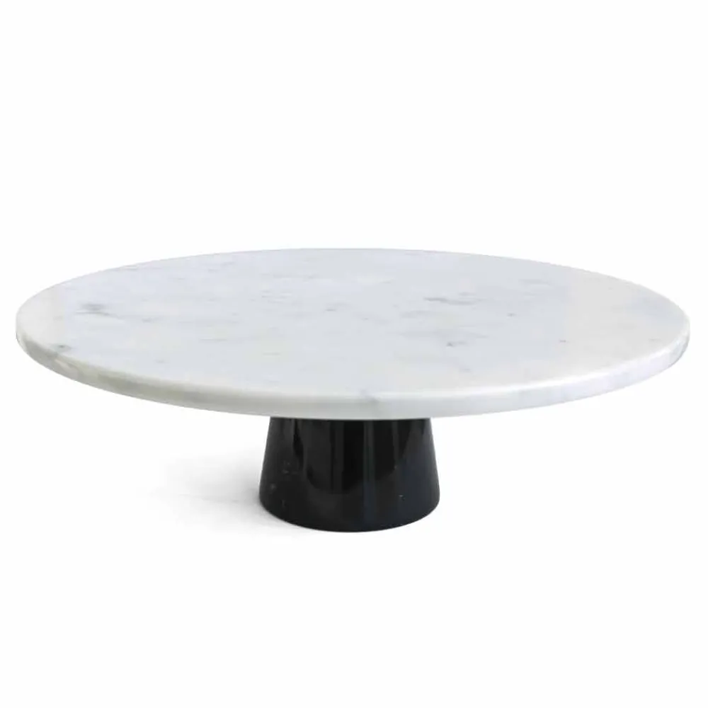 Eleganter moderner Tortenständer mit weißer Carrara- Marmorplatte und schwarzem Marquinia- Marmorsockel. Hergestellt aus hochwertigem feinem Marmor. Es ist ein Unikat, da sich jeder verwendete Marmorblock von den anderen für Adern und Schattierungen unterscheidet.
