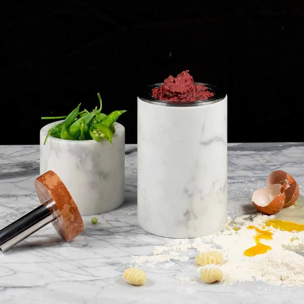Die Materialien spielen eine wichtige Rolle für die Qualität und das Design der Produkte: die Rigagnocchi-Kappe in Eschenholz wird mit Speiseöl behandelt; der Behälter aus weißem Carrara-Marmor und der Fleischhammer aus Sandstein sind poliert und glatt, schließlich bestehen die Strukturelemente aus widerstandsfähigem 316er poliertem und satiniertem Edelstahl.