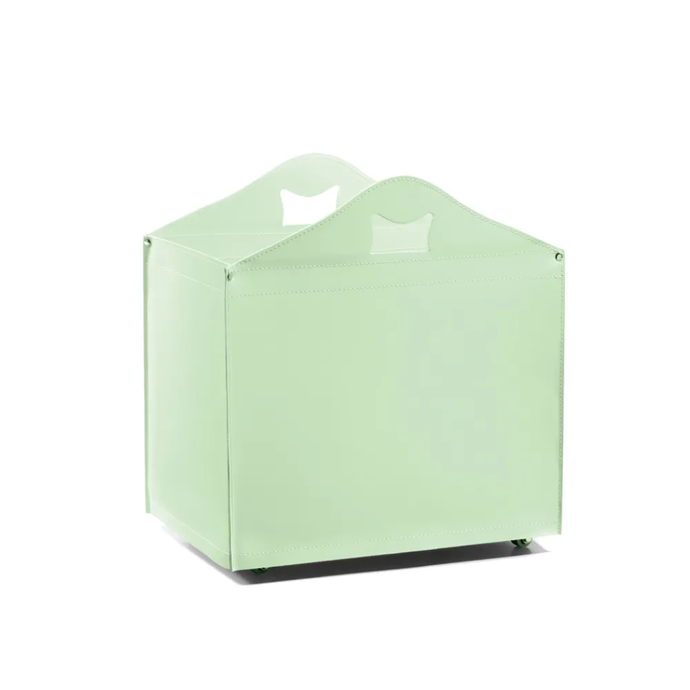 Aufbewahrungstasche aus doppellagigem Leder mit aquagrüner Oberfläche mit internem Sperrholzboden, integrierten Seitengriffen und gummierten Rädern, vollständig in Italien hergestellt.