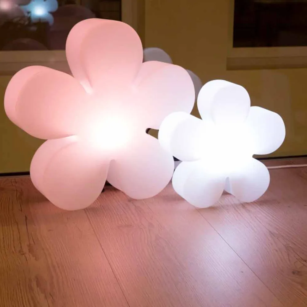 Blumenförmige Stehlampe aus weißem Polyethylen, wahlweise mit Aufsatz und in zwei Größen für drinnen oder draußen.