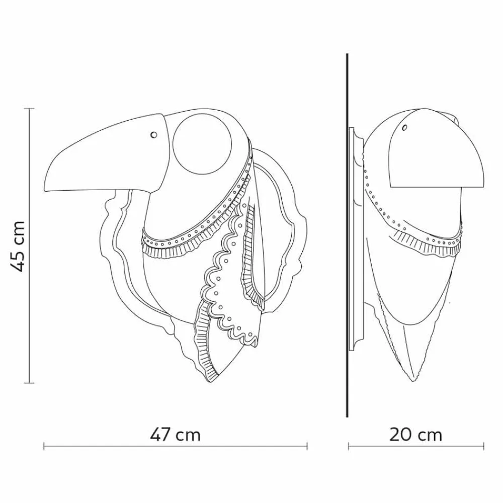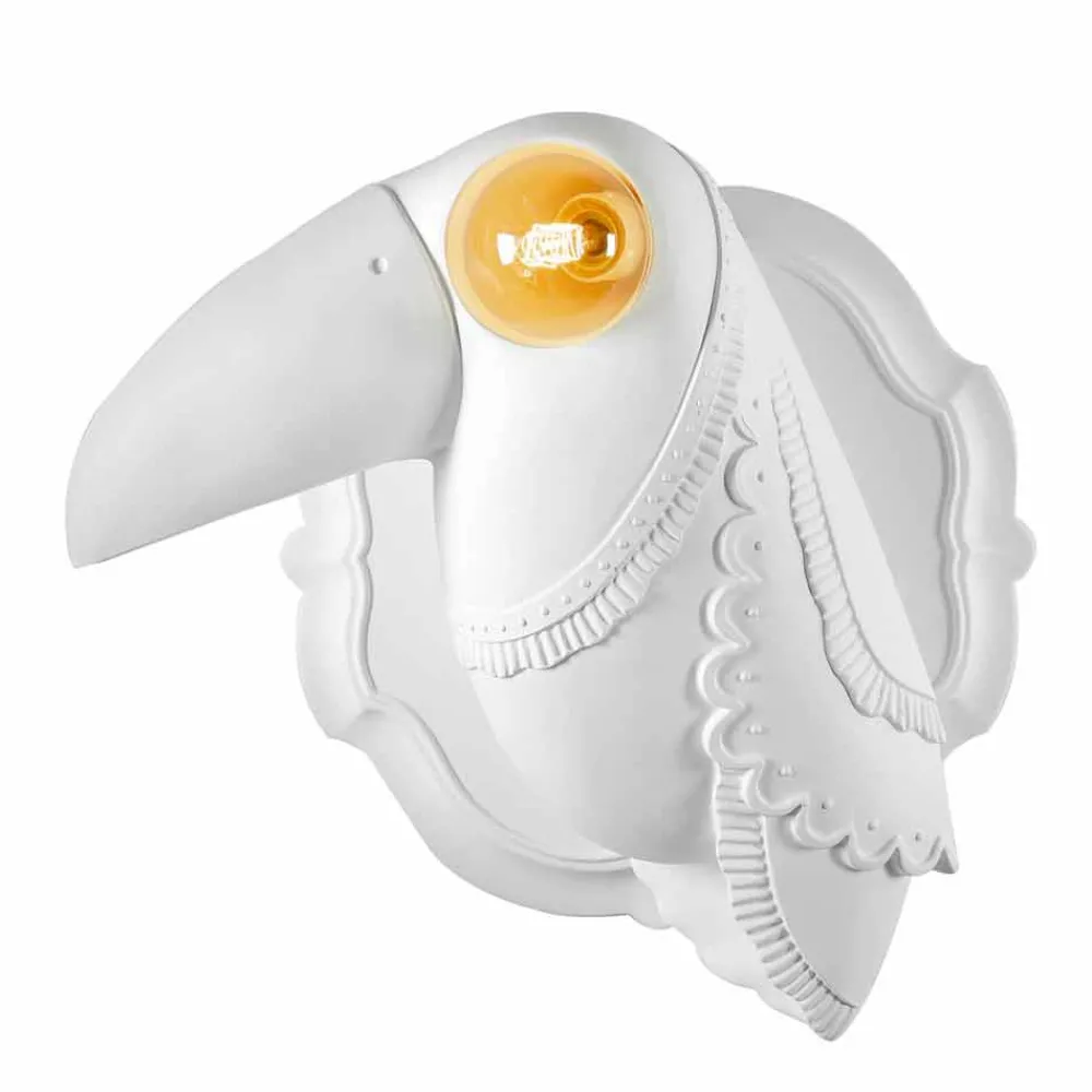 Diese originelle und einzigartige Wandleuchte ist inspiriert von fernen tropischen Ländern und von den Reisen, die jeder von uns unternimmt und die Spuren in uns hinterlassen. Dies ist, was der dargestellte Tukan mit seinem großen und charakteristischen Schnabel tun möchte, der die Authentizität und die tausend Farbtöne, die die Persönlichkeit eines jeden charakterisieren, durch die Darstellung von Leuchtelementen mit einem einzigartigen und innovativen Design verblüfft und anregt.