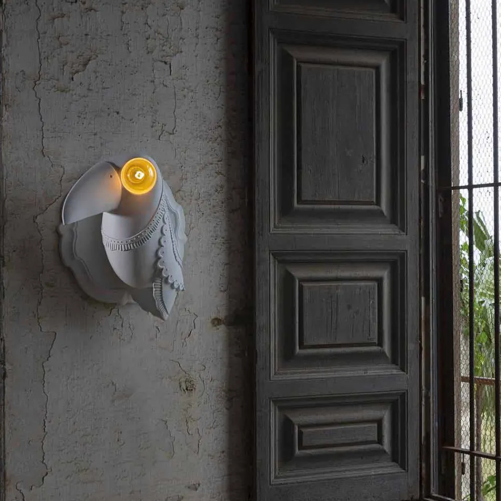 Modernes Design Wandleuchte in Form eines Tukans aus mattweißer Keramik, hergestellt in Italien.