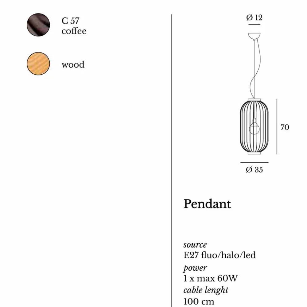 Hängeleuchte aus geformtem Stahlstab und mit Epoxidpulver lackiert. Die zwei Bänder, die den runden Körper schließen, sind aus natürlichem Holz.