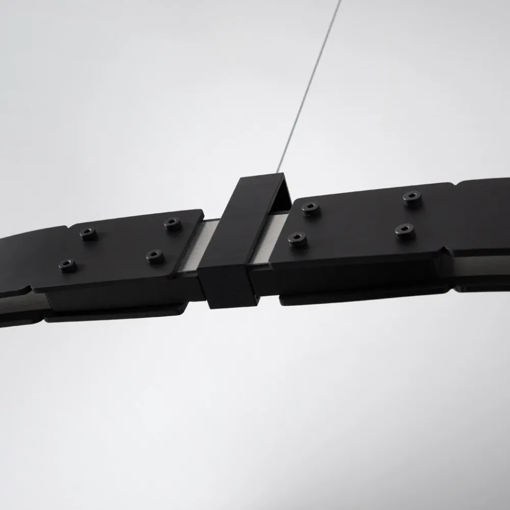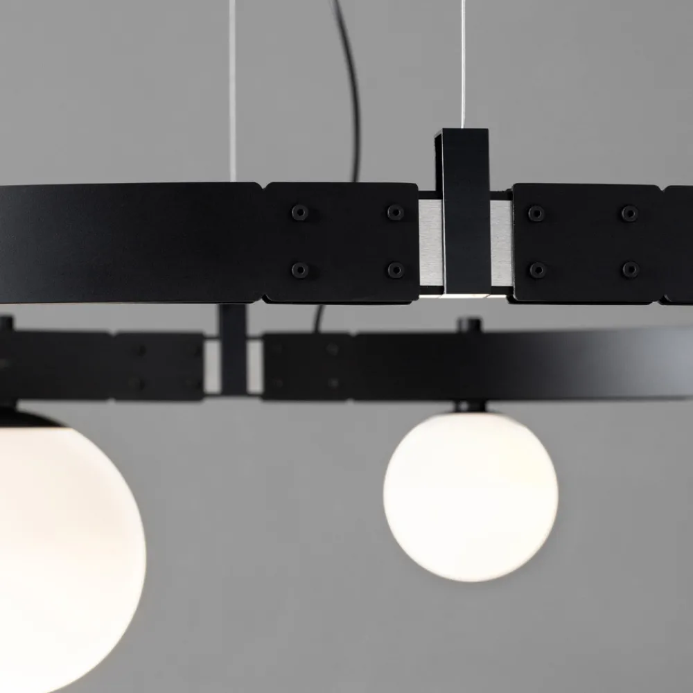 Die ovale Tragstange erinnert an die Ingenieurbauwerke der Vergangenheit und die elektrifizierten modularen Strukturen tragen Lichtkörper ( geblasene Glaskugeln in zwei verschiedenen Größen), die in Quantität und freier Anordnung ohne Verwendung von Stromkabeln platziert werden können, für maximale Freiheit von Ausdruck.
