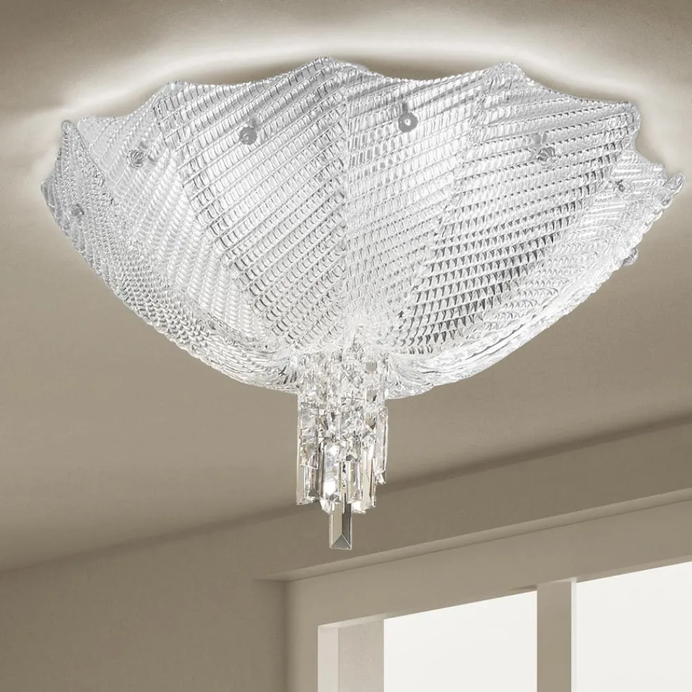 Handgefertigte Deckenlampe aus venezianischem Glas mit weißen Metalldetails . Eine raffinierte Ästhetik mit starker visueller Wirkung, die durch die Ausdruckskraft verzaubert, die ihre bogenförmigen Formen auszeichnet, die durch die spezielle Verarbeitung mit der Plattentechnik erzielt werden. Die wunderbare geometrische Textur, die die gesamte Oberfläche der Lampe bedeckt, wird stattdessen durch die Heißbearbeitung des Glases erreicht, das auch mit hängenden Prismen verziert ist, die die Lichtbrechung betonen und einzigartig machen, um ein einzigartiges, exklusives und raffiniertes Ergebnis zu erzielen.