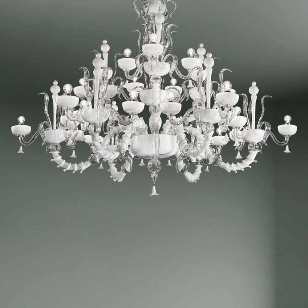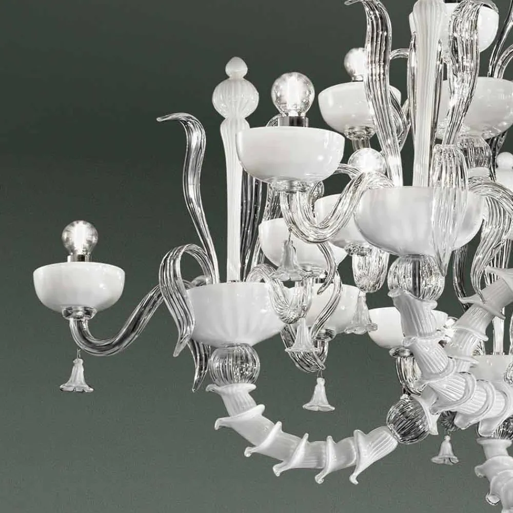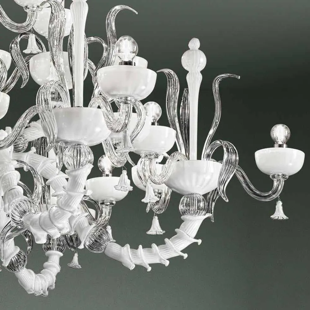 Majestätischer Kronleuchter mit klassischen Linien, handgefertigt in Venedig aus Kristall und milchweißem Glas mit Details aus poliertem Chrommetall . Dieses wundervolle Möbelstück ist aus der Verwendung der alten Technik der Bespannung entstanden, deren Ästhetik auf Konzepten der Innovation basiert und gleichzeitig an die Vergangenheit erinnert . Dieser Kronleuchter ist ideal, um große Räume im Haus zu beleuchten, und zeichnet sich durch seine futuristische Ästhetik dank der wunderbaren milchigen weißen Oberfläche aus, die die Struktur bedeckt. Das Design wird auch durch die sich verjüngenden Arme bereichert, die mit hängenden Glöckchen verziert sind, die vollständig von Hand geformt wurden, um eine hohe Qualität und einen unschätzbaren Wert zu erzielen.