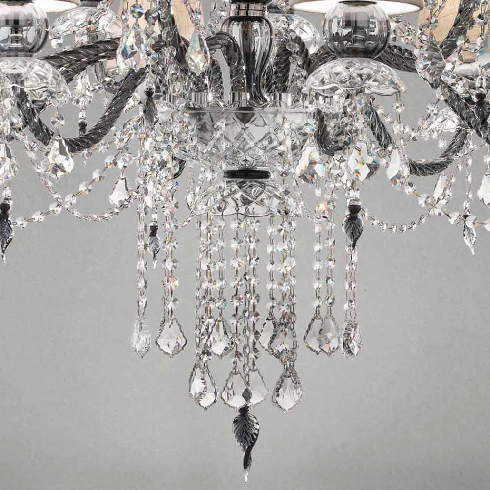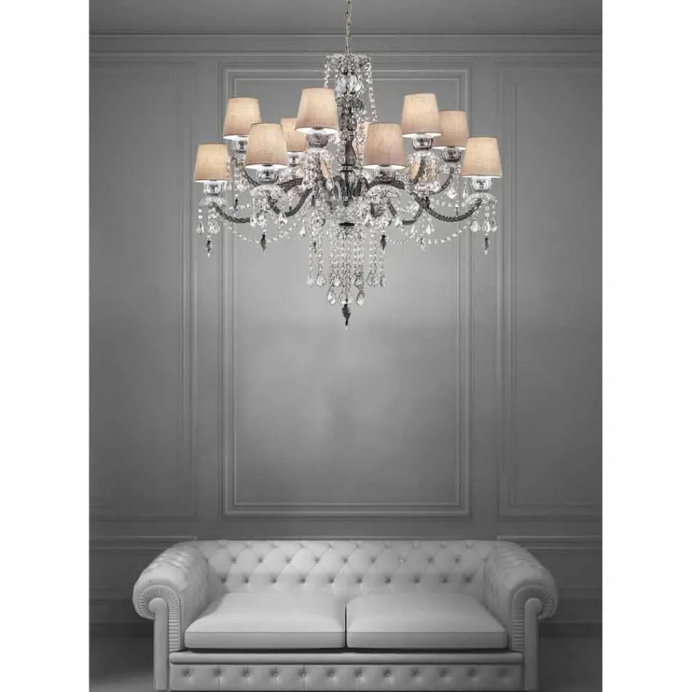 Eleganter und imposanter Kronleuchter mit 12 Lampenschirmen aus Leinen , Struktur in venezianischem Glasgrau, bereichert durch Anhänger in Kristallfinish und Details aus poliertem Chrommetall , handgefertigt in Italien . Dieser Kronleuchter zeichnet sich durch einen romantischen Charakter aus , der große Räume auf exklusive Weise ausfüllen kann, und zeichnet sich durch leuchtende Pendel und raffinierte Lampenschirme aus , die eine dynamische Einrichtungslösung mit starker szenografischer Wirkung zum Leben erwecken . Um seinen Wert zu steigern und seine ästhetische Seite zu unterstreichen, ist das Vorhandensein von Pailletten, die durch die Lichtbrechung dank beispielloser farbiger Blitze wunderbare Licht- und Schattenspiele zum Leben erwecken.