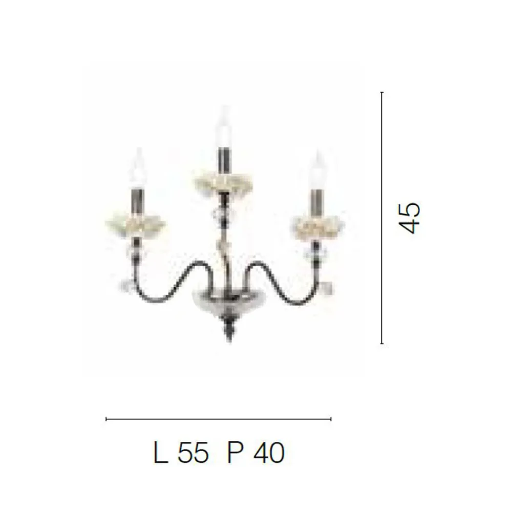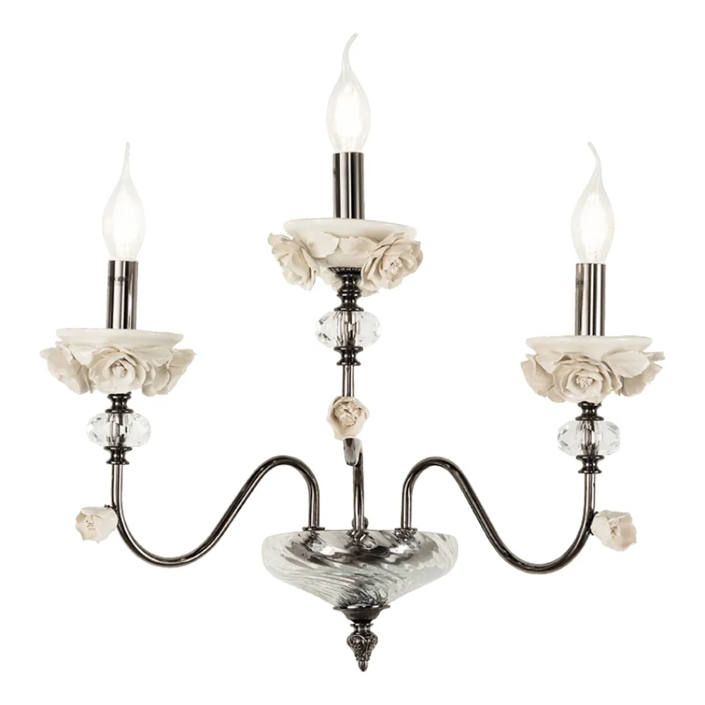 Die 3-Licht- Wandleuchte ist ein luxuriöses Beleuchtungszubehör , das vollständig in Italien aus feinem Porzellan und hochwertigem mundgeblasenem Glas handgefertigt wird und auf einer Metallstruktur mit silbernen Schweißnähten ruht.