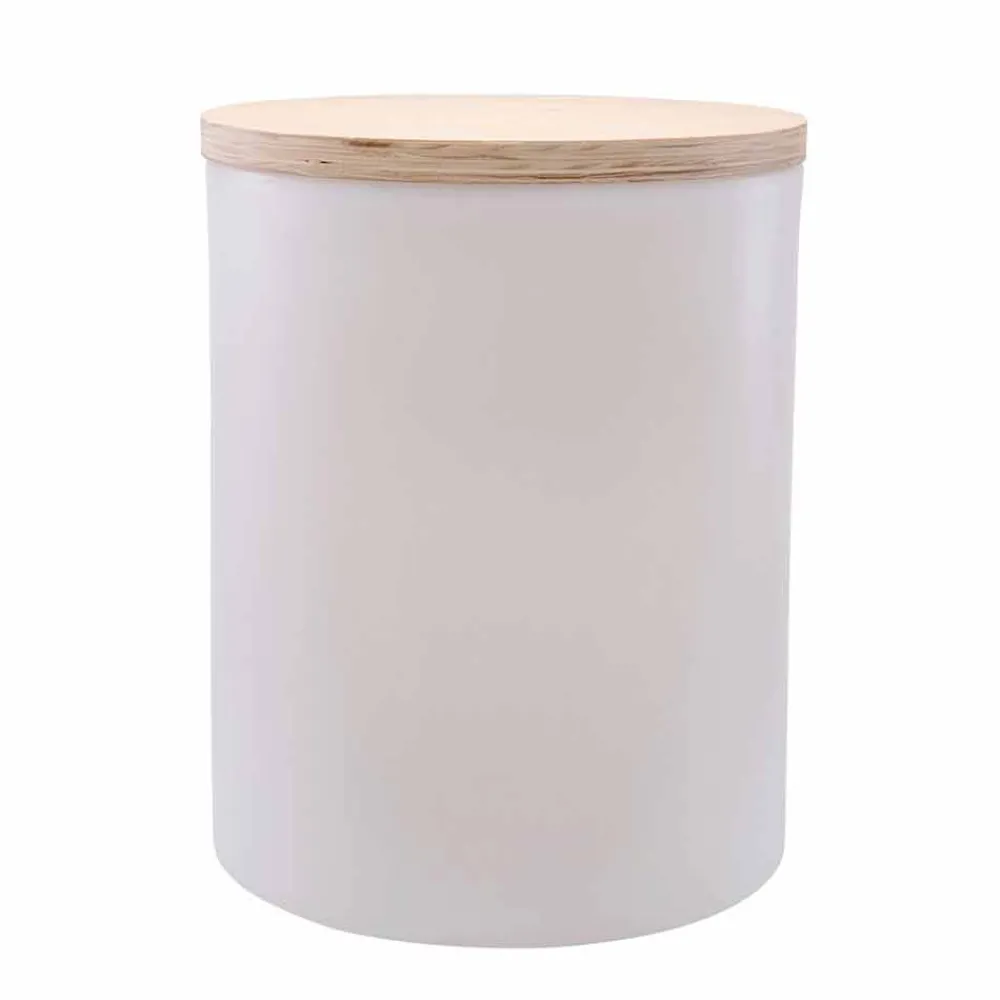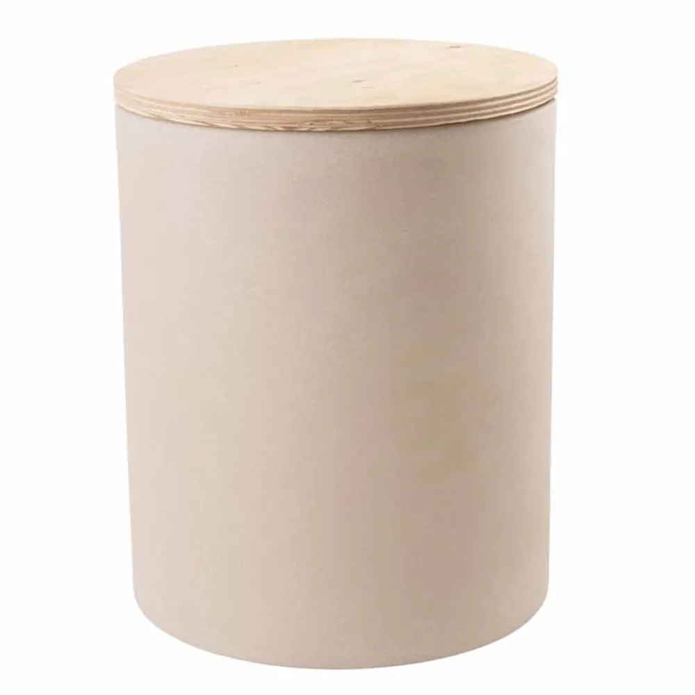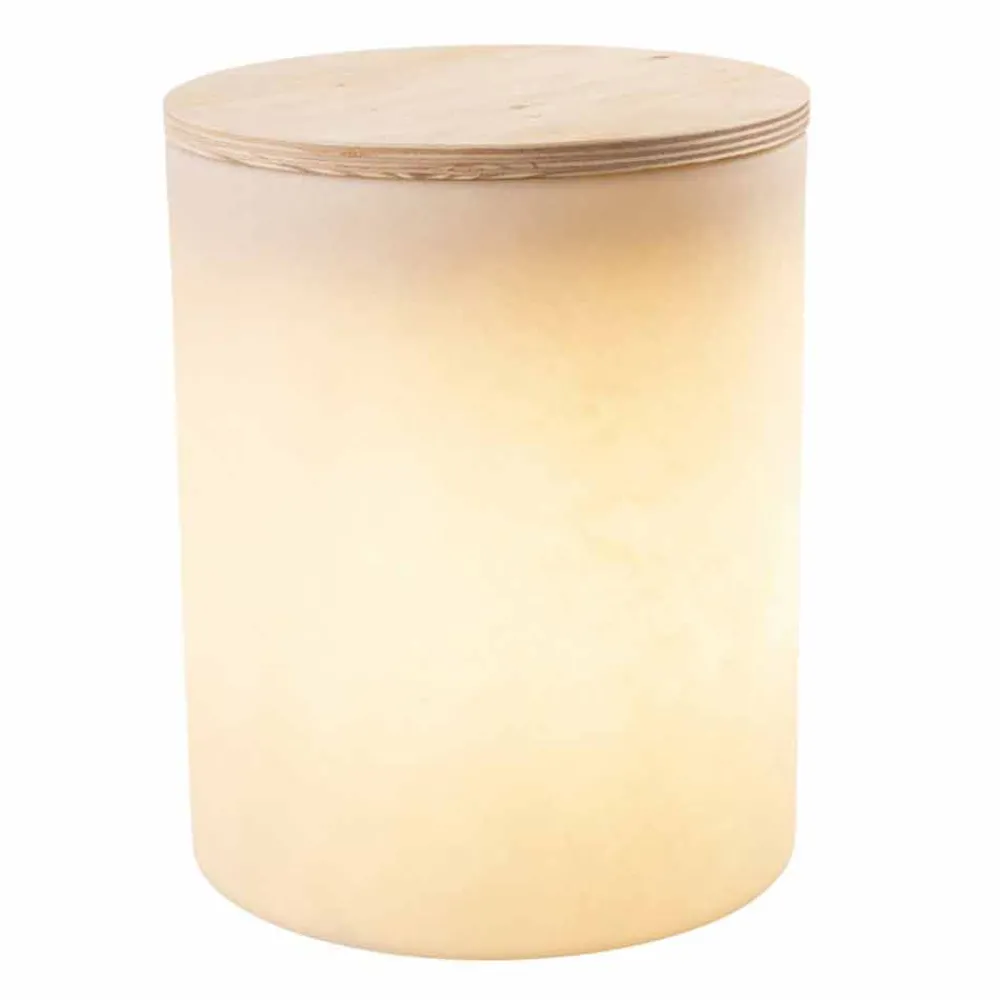 Heller zylindrischer Couchtisch aus farbigem Polyethylen mit Holzplatte für den Garten oder das modern gestaltete Wohnzimmer.