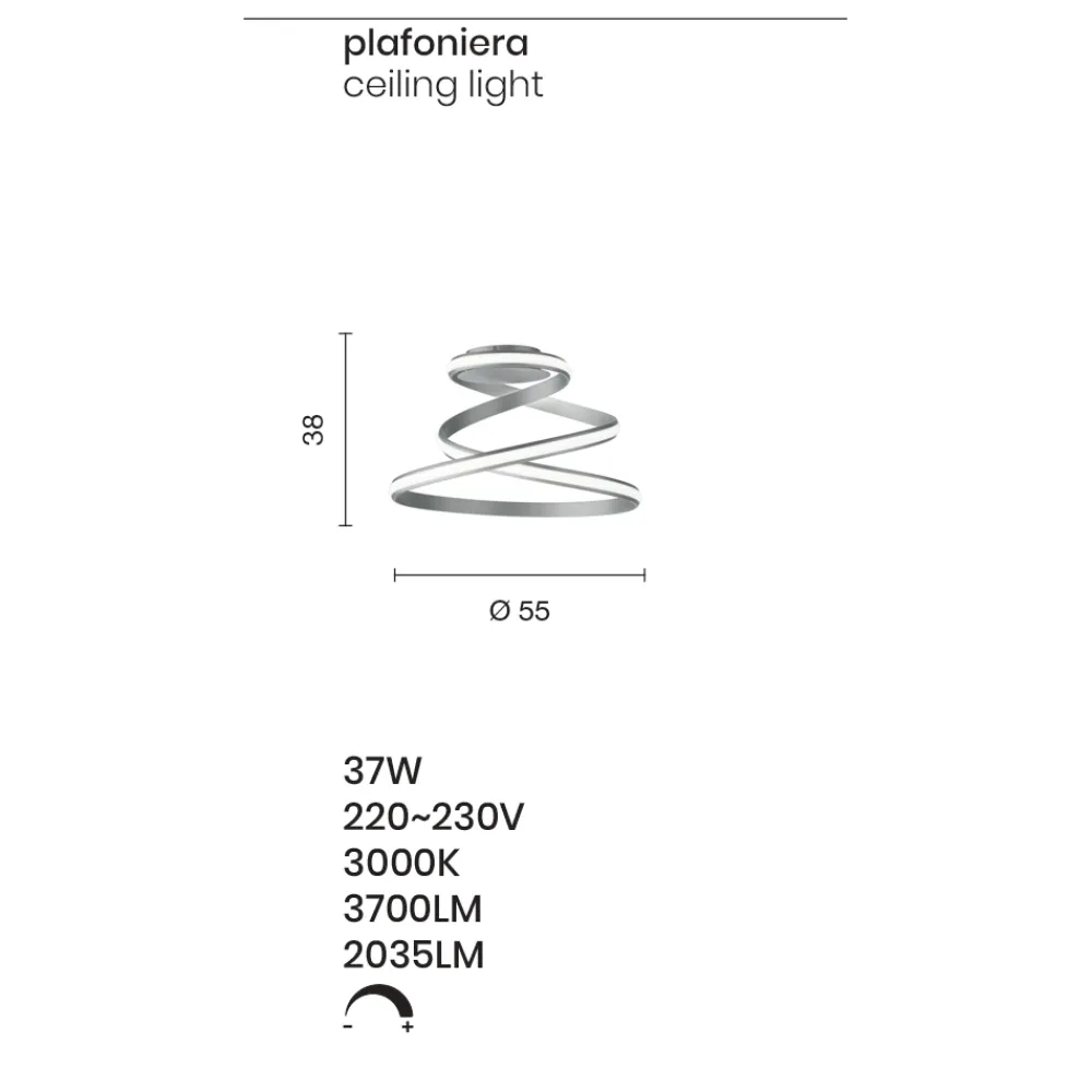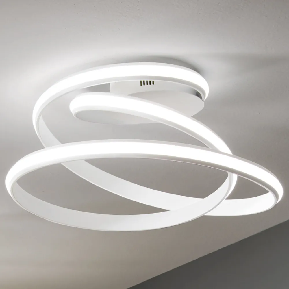 Deckenleuchte mit weiß lackierter Metallstruktur komplett mit LED-Lichtquelle . Ein dynamisches und modernes Design, das in der Lage ist, das Gefühl eines sich drehenden Bandes nachzubilden und so den Wert und die Ästhetik des Produkts zu bereichern. Dieses Bewegungsgefühl wird zu seiner Stärke und ermöglicht es ihm, in Wohn- oder Objektumgebungen mit einem zeitgenössischen und avantgardistischen Stil den Mittelpunkt der Aufmerksamkeit zu erobern. Die moderne LED-Technologie sorgt zudem für eine hochwertige Beleuchtung, die die Leuchte vervollständigt und sie zu einer optimalen Ergänzung für alle macht, die Funktionalität und Design in einem einzigen Produkt suchen.