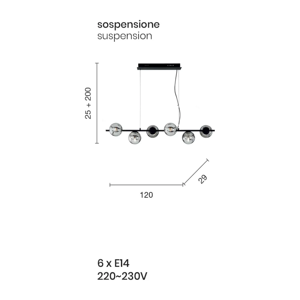 Pendelleuchte mit 6 Lichtern mit Metallstruktur und kugelförmigen Diffusoren aus mundgeblasenem Glas komplett mit höhenverstellbaren Kabeln. Aus der perfekten Kombination des modernen Hauchs von Metall und der zeitlosen Eleganz von mundgeblasenem Glas entsteht eine originelle und raffinierte Einrichtungslösung , die in der Lage ist, in modernen Wohnumgebungen den Mittelpunkt der Aufmerksamkeit zu erobern. Seine Struktur entwickelt sich auf einer einzigen Linie, was ihn zu einer besonders geeigneten Lösung für die Beleuchtung Ihres Tisches im Esszimmer oder in der Küche macht.