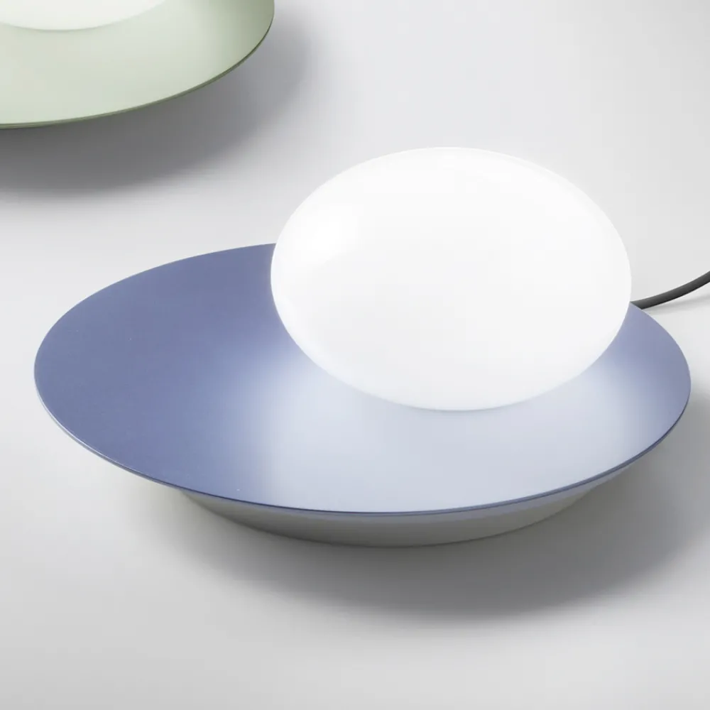 Innenleuchte mit einem Rahmen aus recycelbarem Aluminium, einer Deckenrosette aus Metall und einem Lampenschirm aus milchig-weißem geblasenem Glas. Die Leuchte ist über einen Berührungssensor in der Deckenrosette dimmbar.