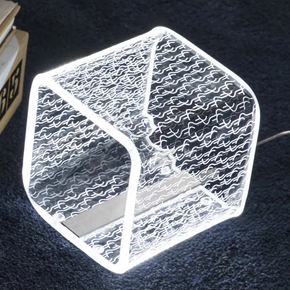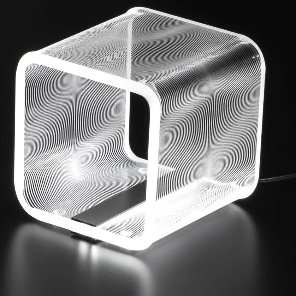 Dies führte Tischlampe ist viel mehr als eine einfache Leuchte: vollständig aus gefalteten Acrylkristall in 2 Varianten von laser- gravierten Texturen , dass die chromatischen Nuancen verbessern, leuchten die Originalstiche entlang aller Wände dank einer einzigen LED – Leiste oben platziert das Zentrum.