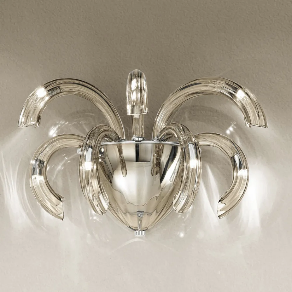 In Italien handgefertigte Wandlampe aus venezianischem Glas, geräuchertes Finish mit verchromten Metalldetails . Eine faszinierende Ästhetik, die sich dank ihrer Formen und der Funktionalität ihres Designs an jede Art von Umgebung anpasst, in die sie sich mit Überschwänglichkeit einfügt. Die wunderschönen und elegant geschwungenen Arme erweitern sich nach außen, um Licht in verschiedene Richtungen zu bringen und den Raum durch einen originellen szenografischen Effekt zu beleuchten, der an die Explosion eines Feuerwerks erinnert, um ein kreatives , raffiniertes und starkes visuelles Ergebnis zu erzielen.
