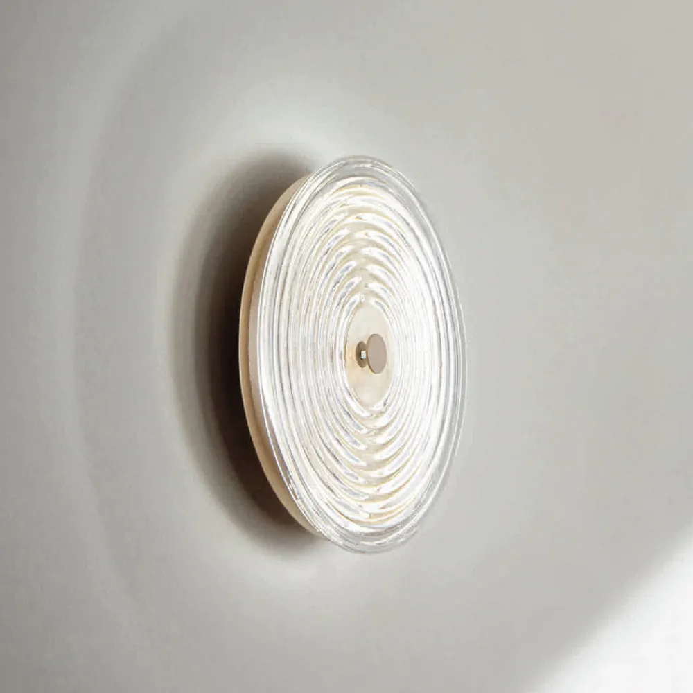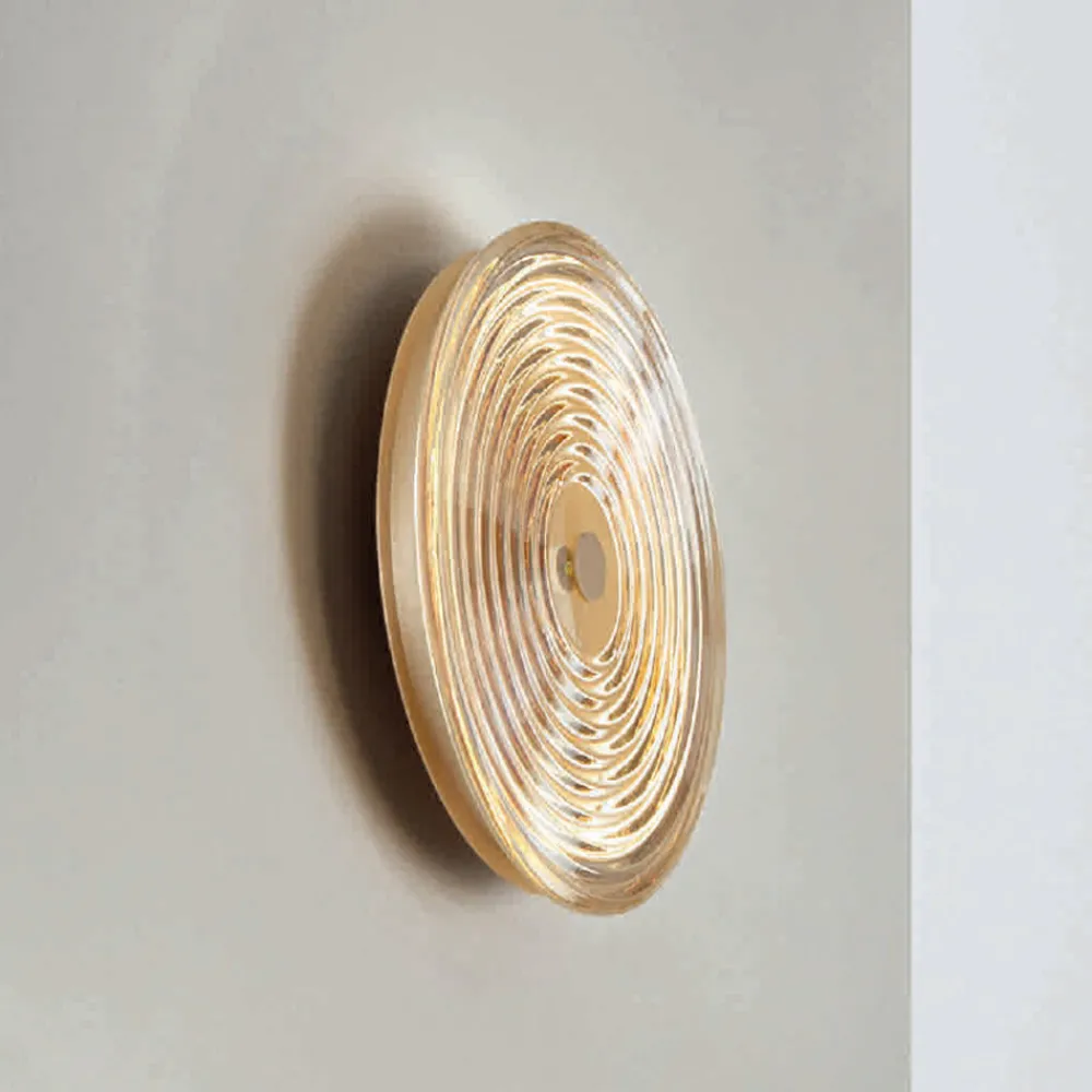 Komplett in Italien hergestellte Wandleuchte aus goldfarben lackiertem Metall, mit konzentrischen Linien verziertes Glas mit LED -Licht.