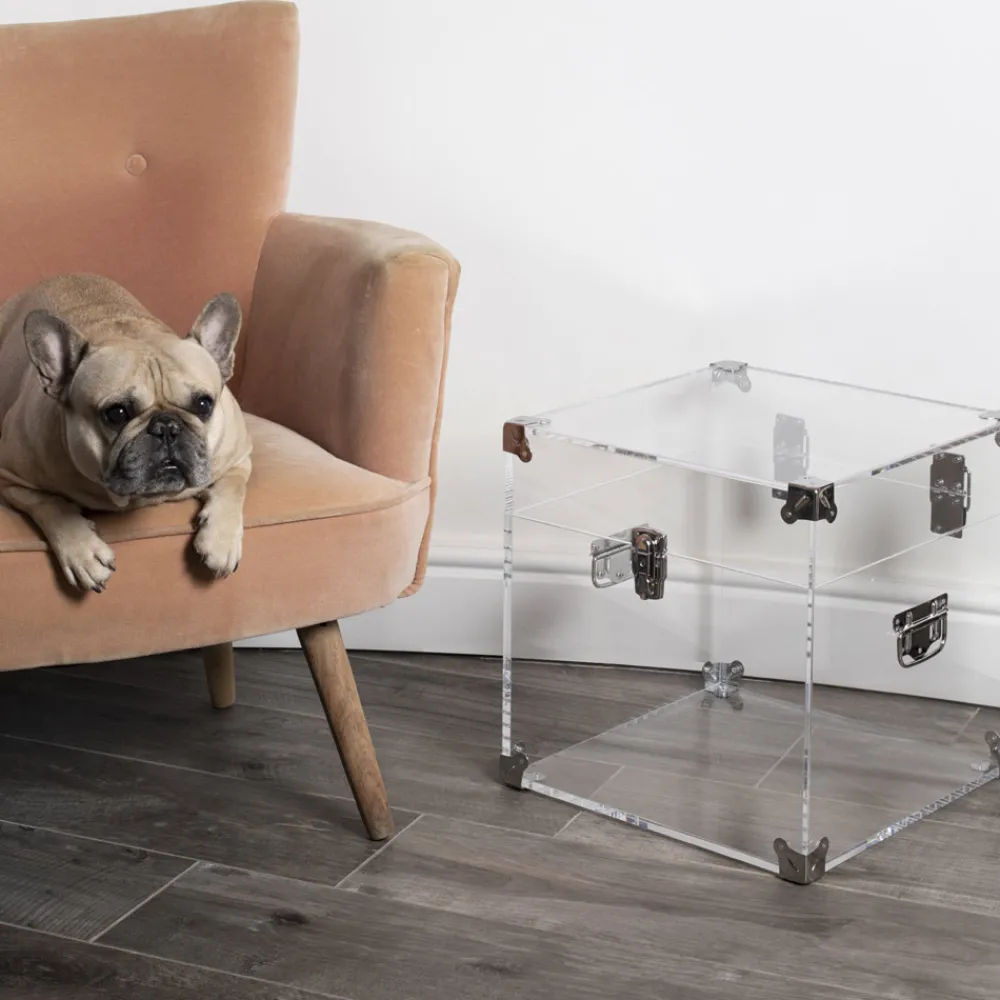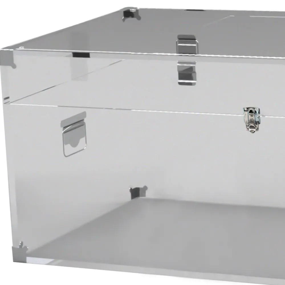 Dieser Koffer besteht vollständig aus gefaltetem Acrylglas, erhältlich in 2 Varianten mit einer Dicke von 10 mm, vollständig UV-verklebt mit edlen verchromten Stahloberflächen.