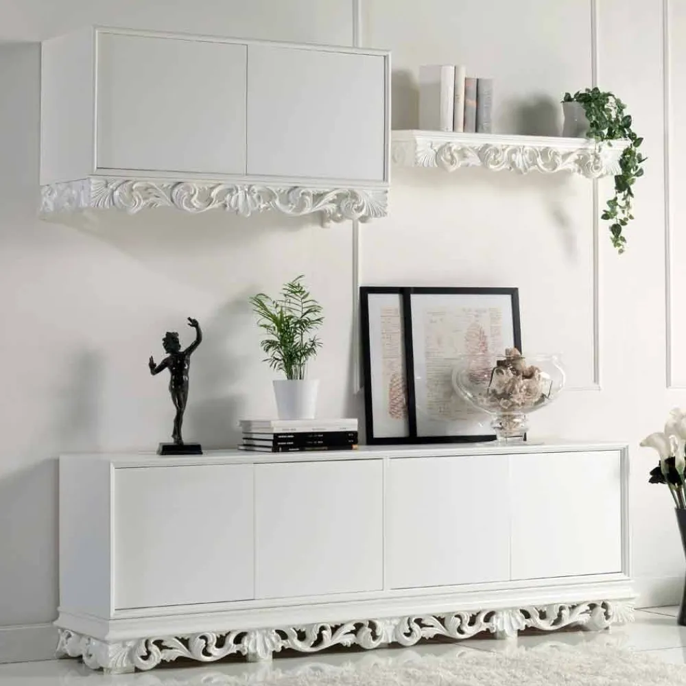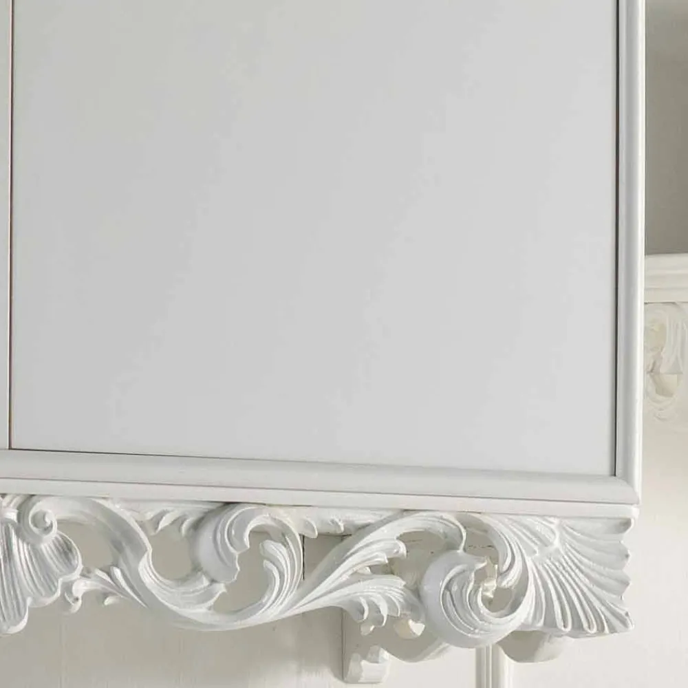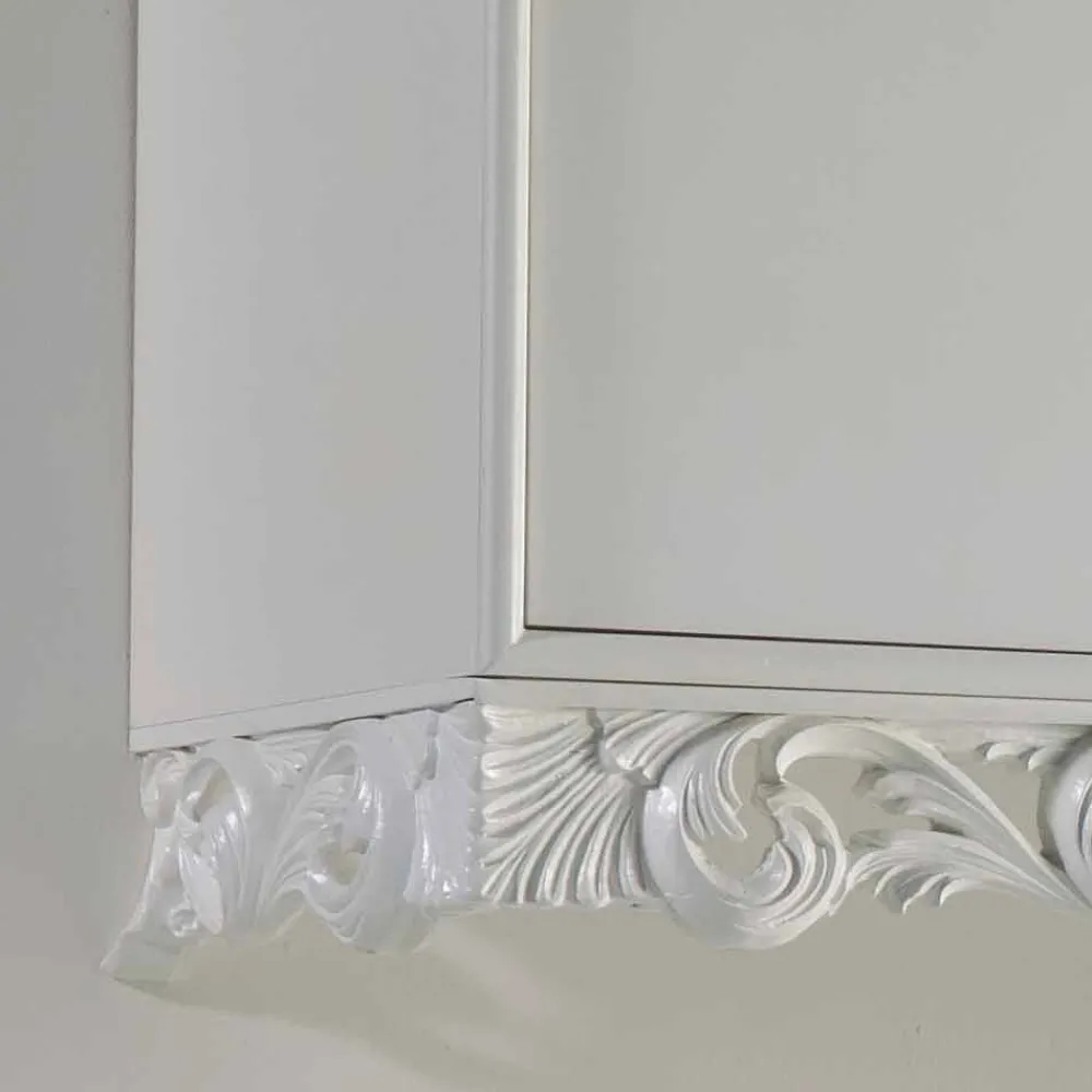 Der im klassischen Stil gehaltene Hängeschrank präsentiert sich in einem typisch matten weiß Finish und dezenten Verzierungen am unteren Rand des Sideboardes.