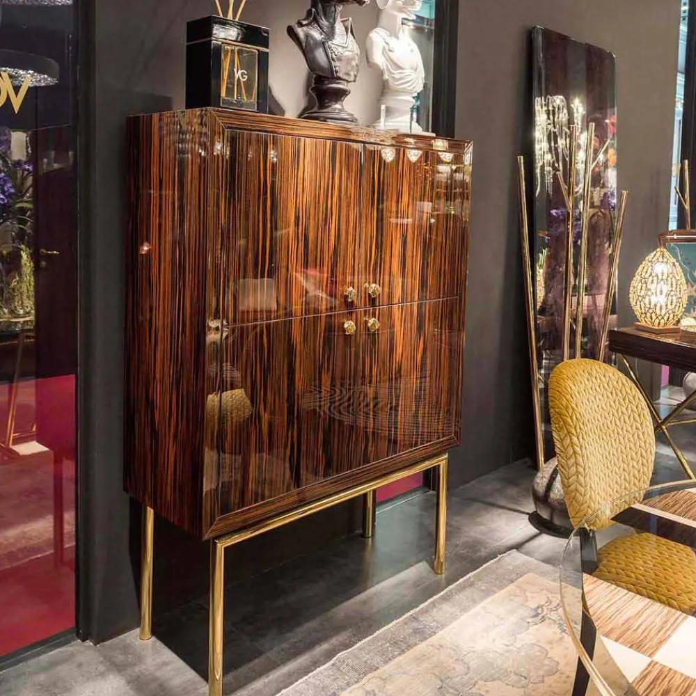 Seine Struktur besteht aus glänzendem Ebenholz, 45°-Verbindung, mit gebürsteten glänzenden 20-Zoll-Kanten und einer Rückseite wie die Vorderseite. Der Innenraum ist matt lackiert, mit einer verspiegelten Rückseite und einem strukturellen Regal (plus zwei Glasböden im Lieferumfang enthalten), Salice-Scharnieren mit Soft-Close.
