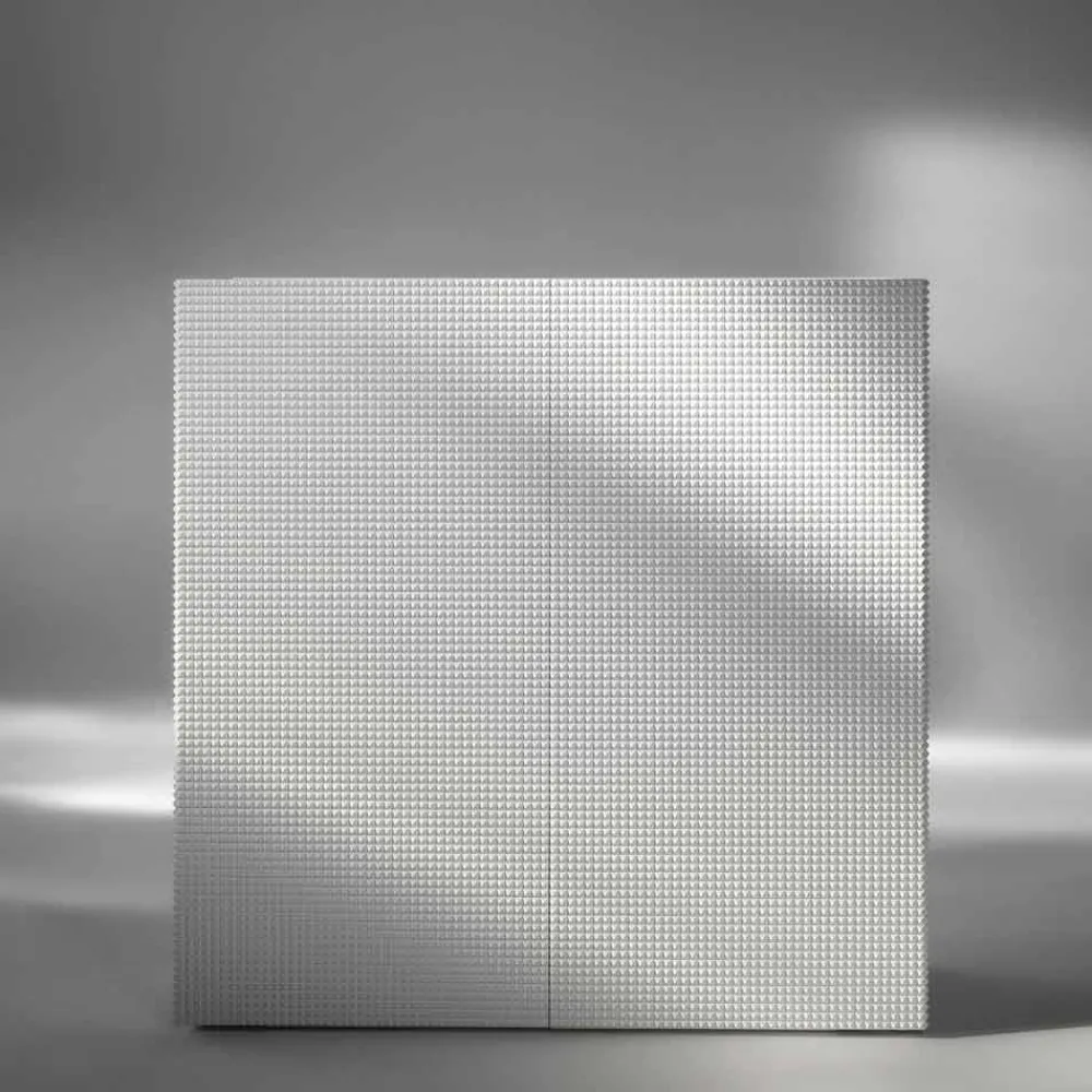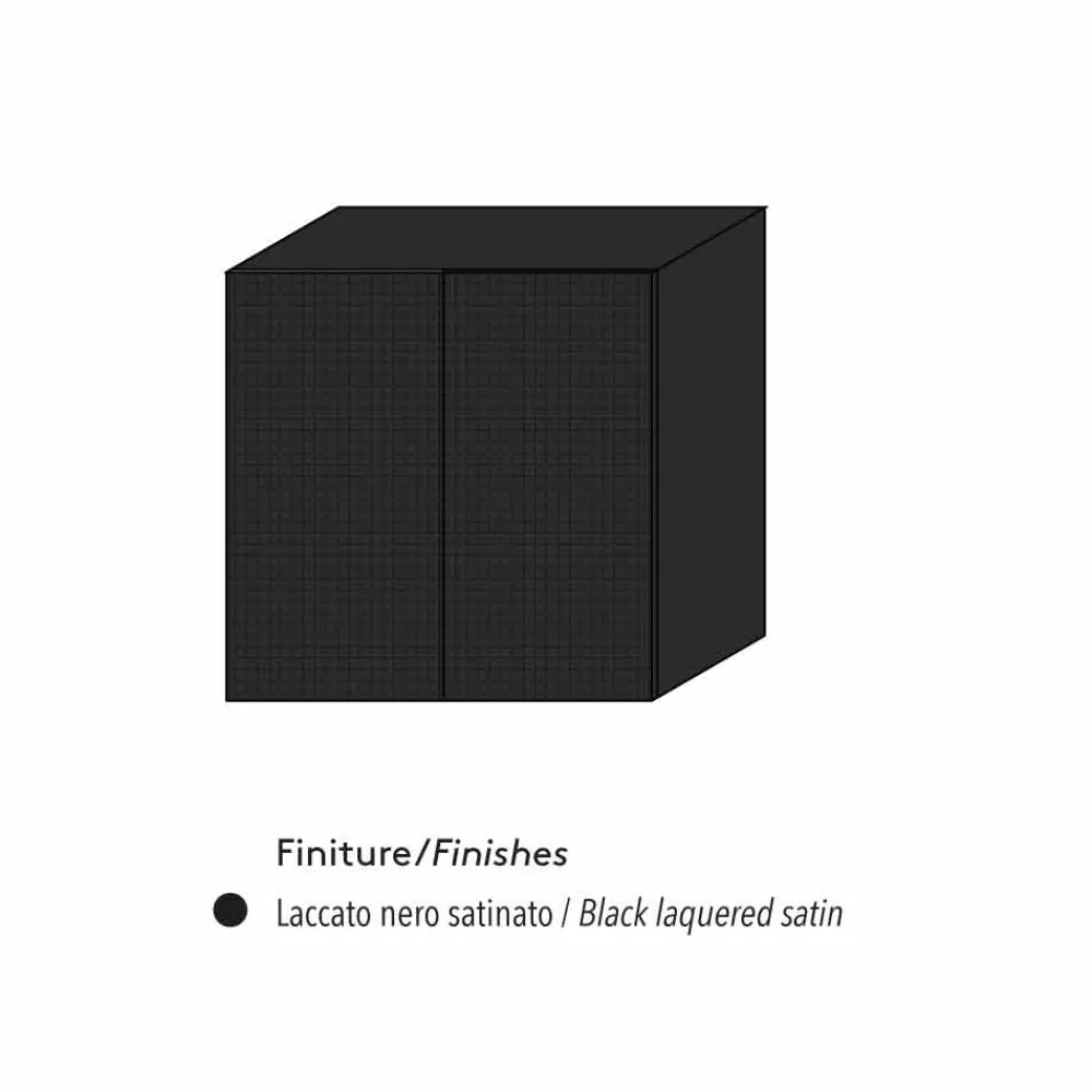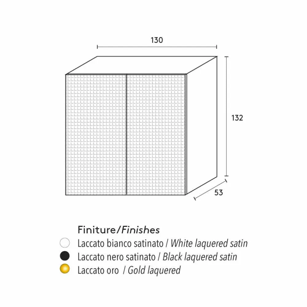 Sideboard mit 2 seitlich öffnenden Schranktüren. Die Anrichte besteht aus lackierten MDF Holz, die eine kubische Oberflächenoptik aufweist. Die Anrichte besteht aus 2 Innenregalen und sorgt somit für genügend Stauraum. Die Oberfläche der Ablagefächer bestehen aus einseitig lackierten Glas mit einer satinierten Oberfläche.