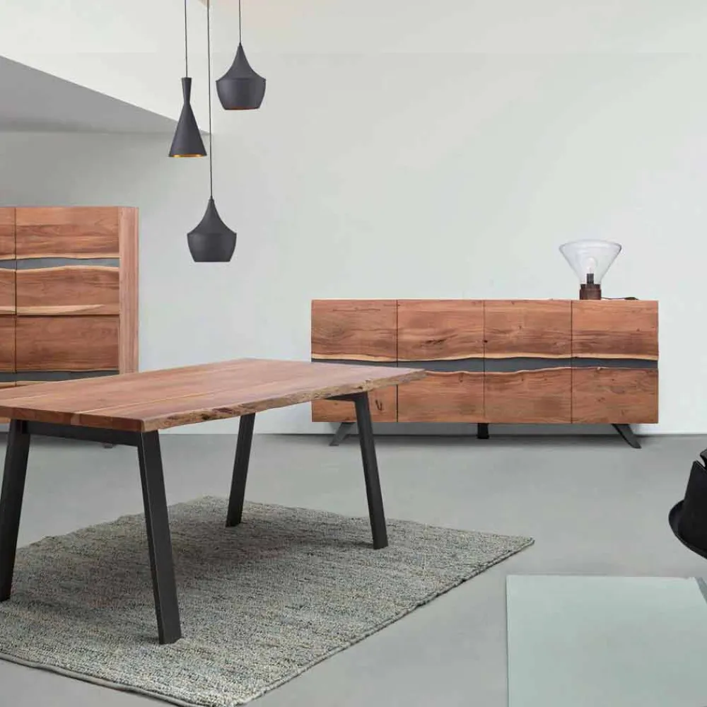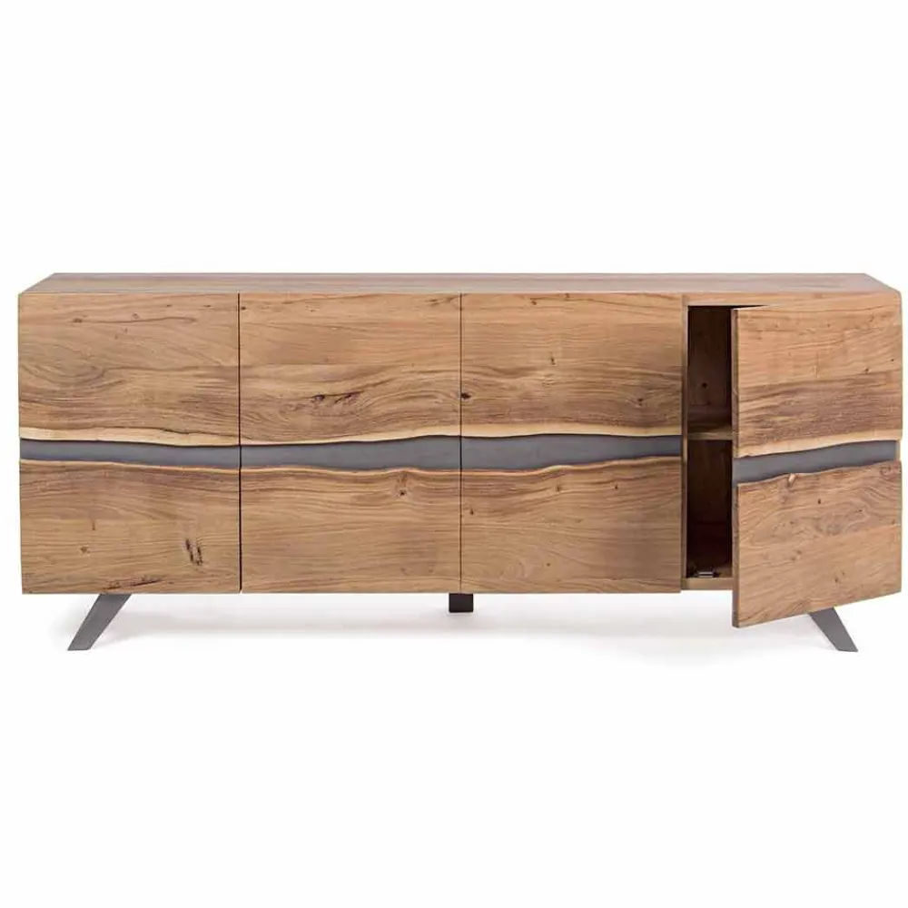Struktur aus Akazienholz , Beine aus epoxidpulverbeschichtetem Stahl . Türen mit Metalleinsätzen . Finish auf Basis von Polyurethanfarbe. Türfach inklusive Regal.