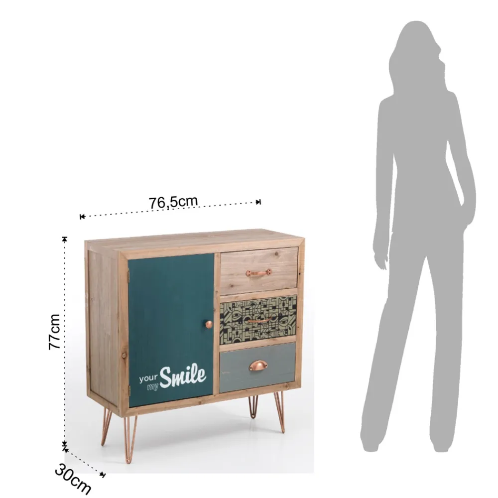 Sideboard aus massivem Tannenholz mit gealtertem Holzfinish und dekoriert mit 3 farbigen/dekorierten/holzfarbenen Schubladen , 1 farbigen und dekorierten Tür , Griffen und Füßen aus kupferfarbenem Metall , komplett .