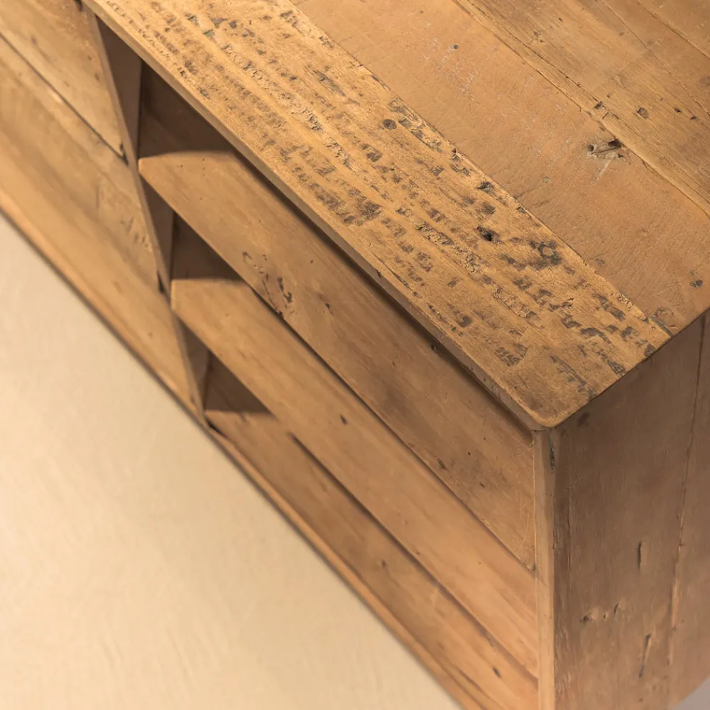 Dieses Einrichtungsset ist buchstäblich einzigartig , gerade weil es die besondere Geschichte der gelebten Materie verkörpert. Die Verarbeitung erfolgt größtenteils nach handwerklichen Verfahren . Jeder Kratzer und jede Unvollkommenheit, jede Narbe im Holz zeugt von der Originalität einer Vergangenheit, die neues Leben annimmt. Das legal aus alten Artefakten, Booten und verlassenen Gebäuden recycelte Tropenholz wird fachmännisch behandelt und gebürstet, um Würde und Glanz wiederzuerlangen. Dieses Produkt kombiniert die Essenz des rustikalen Geschmacks mit den Formen des zeitgenössischen Designs und einigen Details des industriellen Stils .