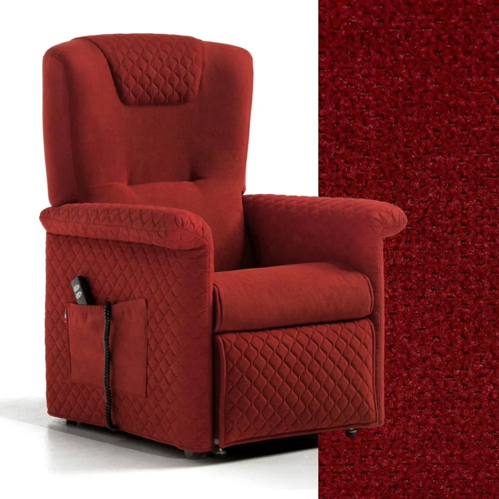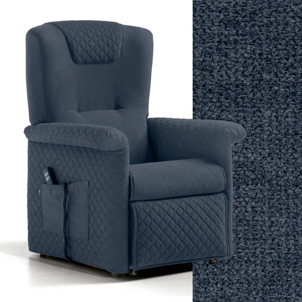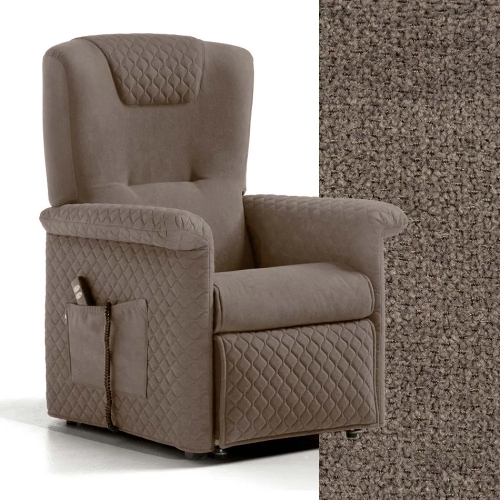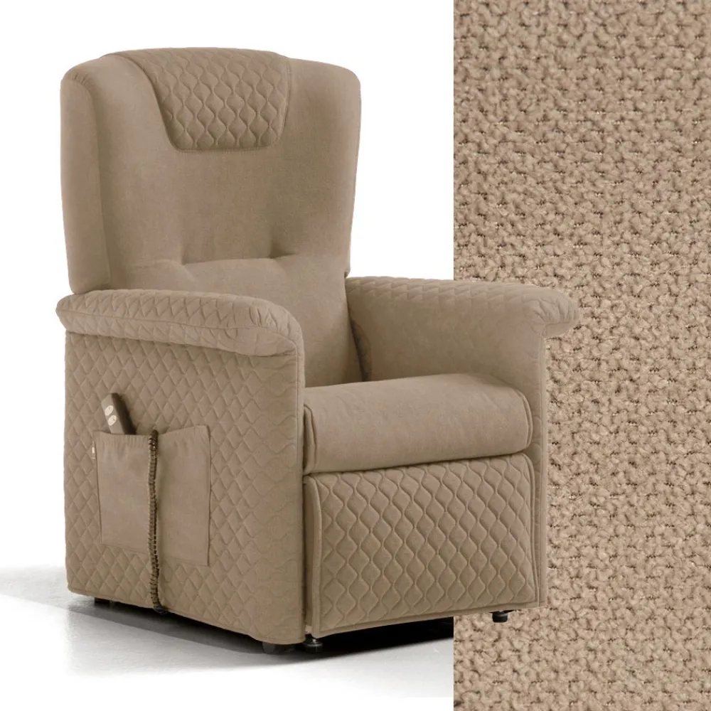 Sessel mit Eisen- und Holzstruktur , Polsterung aus unverformbarem Polyurethanschaum unterschiedlicher Dichte , 2-motorige Mechanik mit Hebe-/Entspannungs-/Bettfunktion und hochwertiger Stoff mit hoher Verschleiß- und Rollenbeständigkeit als Standard.