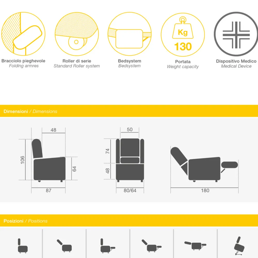 - Länge: 80 cm offene Armlehnen – 64 cm geschlossene Armlehnen