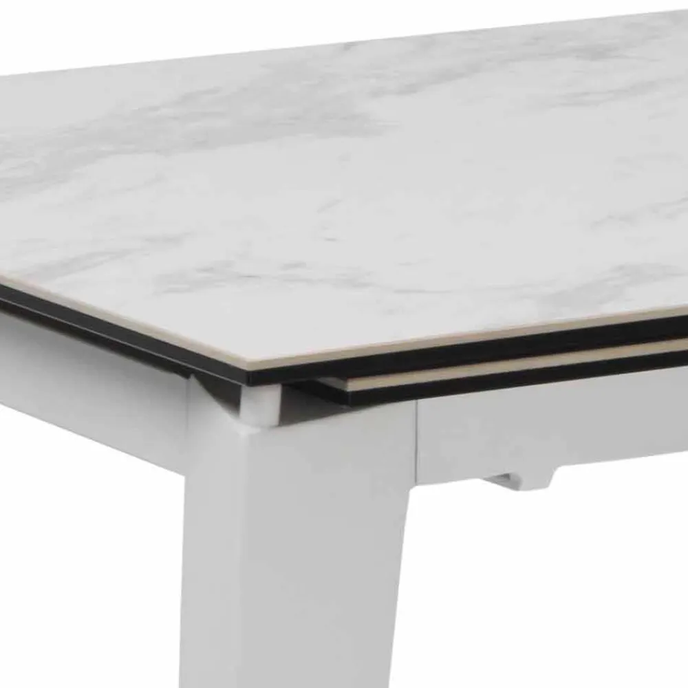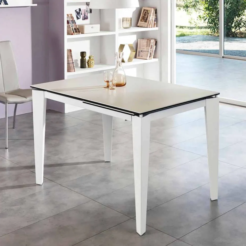 Ausziehbarer rechteckiger Tisch mit matt lackiertem Metallfuß. Oberseite und Verlängerung in Glas und Keramik (untere Schicht in Glas, obere Schicht in Keramik). Dank der praktischen Erweiterung ist es möglich, den Tisch auf eine Länge von 170 cm zu verlängern.