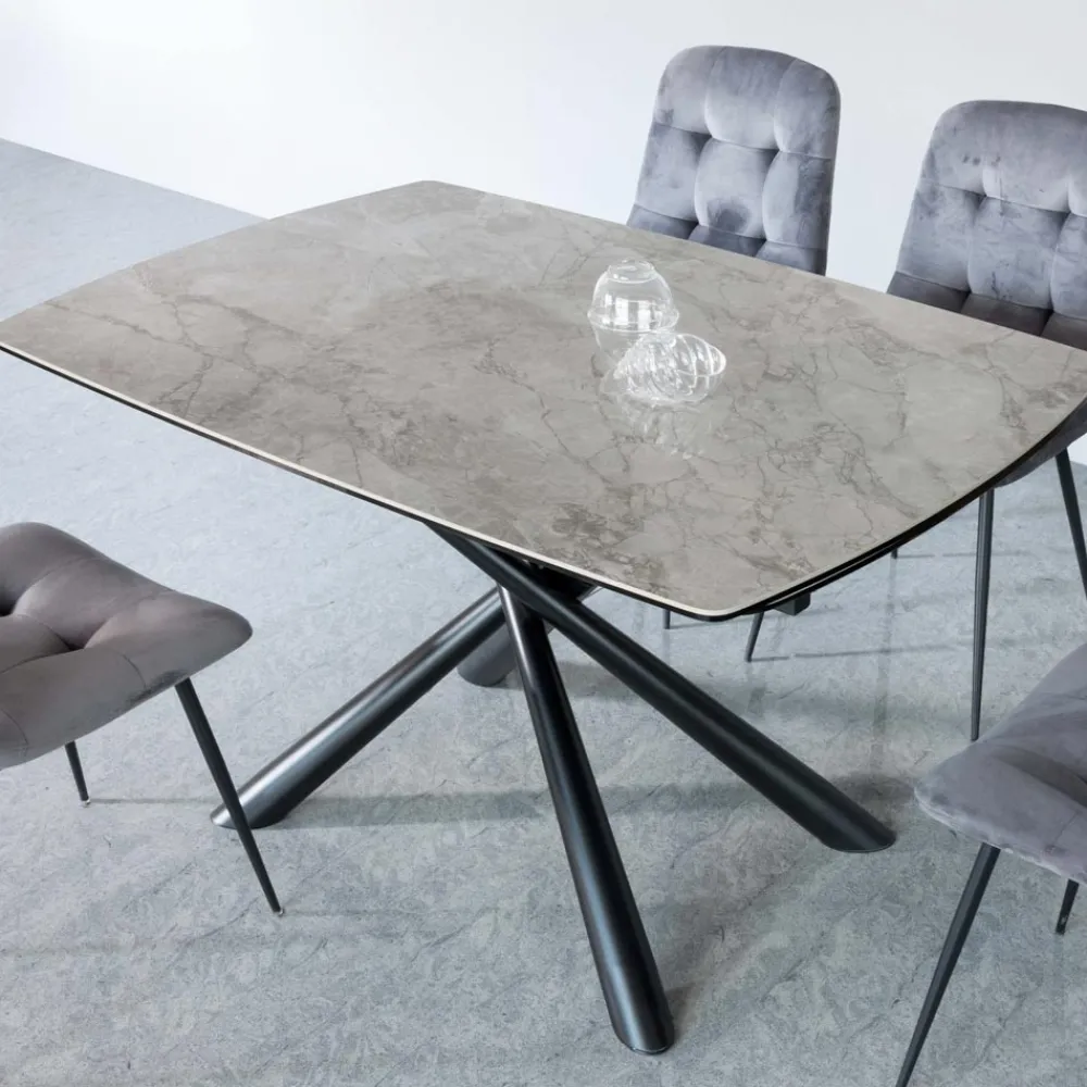 Ausziehbarer Esstisch mit Glaskeramikplatte (6 mm Keramik + 8 mm Glas) in Marmoroptik und lackiertem Metallgestell.