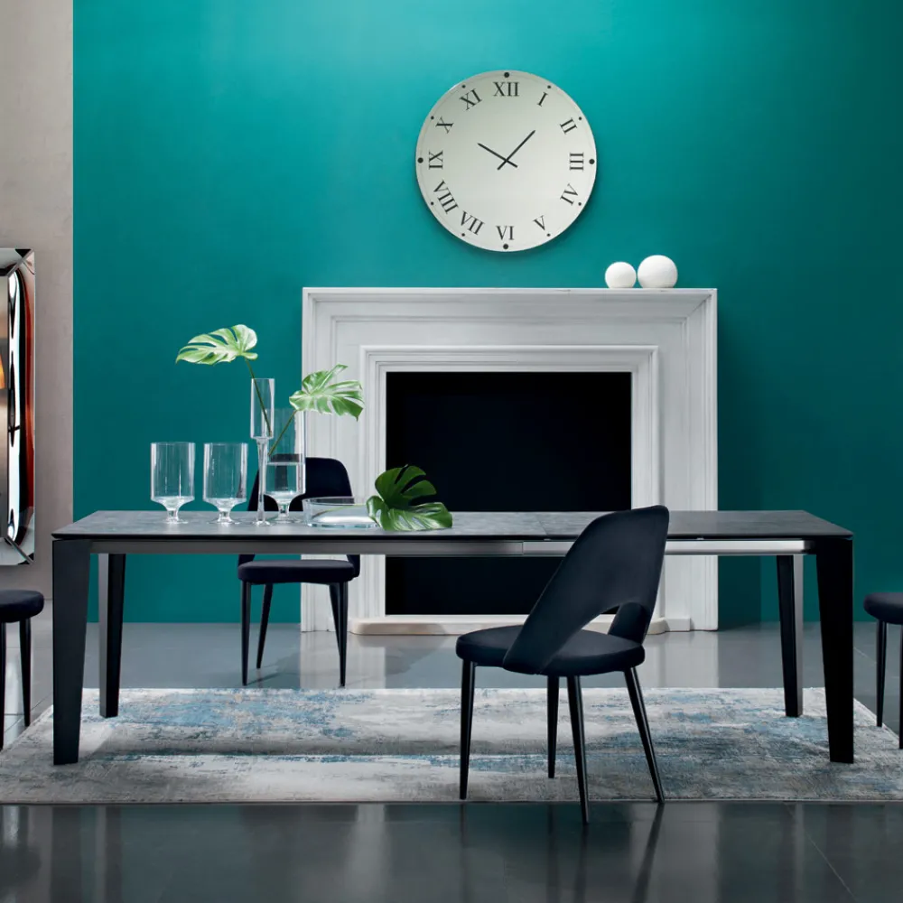 Esstisch mit ausziehbarer Platte aus HPL-Laminat in Steinoptik mit 45° abgeschrägtem Kantenprofil und schwarz lackiertem Stahlgestell . Ein in Italien handgefertigtes Einrichtungsaccessoire mit hochwertigen Materialien und 100 % Made in Italy , das die perfekte Verbindung von Eleganz und Funktionalität zum Leben erweckt. Seine Besonderheit stellt die praktische ausziehbare Platte dar, die eine Länge von 310 cm erreichen kann und so Platz für bis zu 16 Personen für wunderbare Mittag- und Abendessen in Gesellschaft bietet. Sein solides und elegantes Design wird durch die HPL-Oberseite unterstrichen und bereichert, ein Hochdrucklaminat, das äußerst beständig gegen Chemikalien, Abrieb und Kratzer ist und eine solide Auflagefläche mit ausgezeichneter Haltbarkeit im Laufe der Zeit bietet.