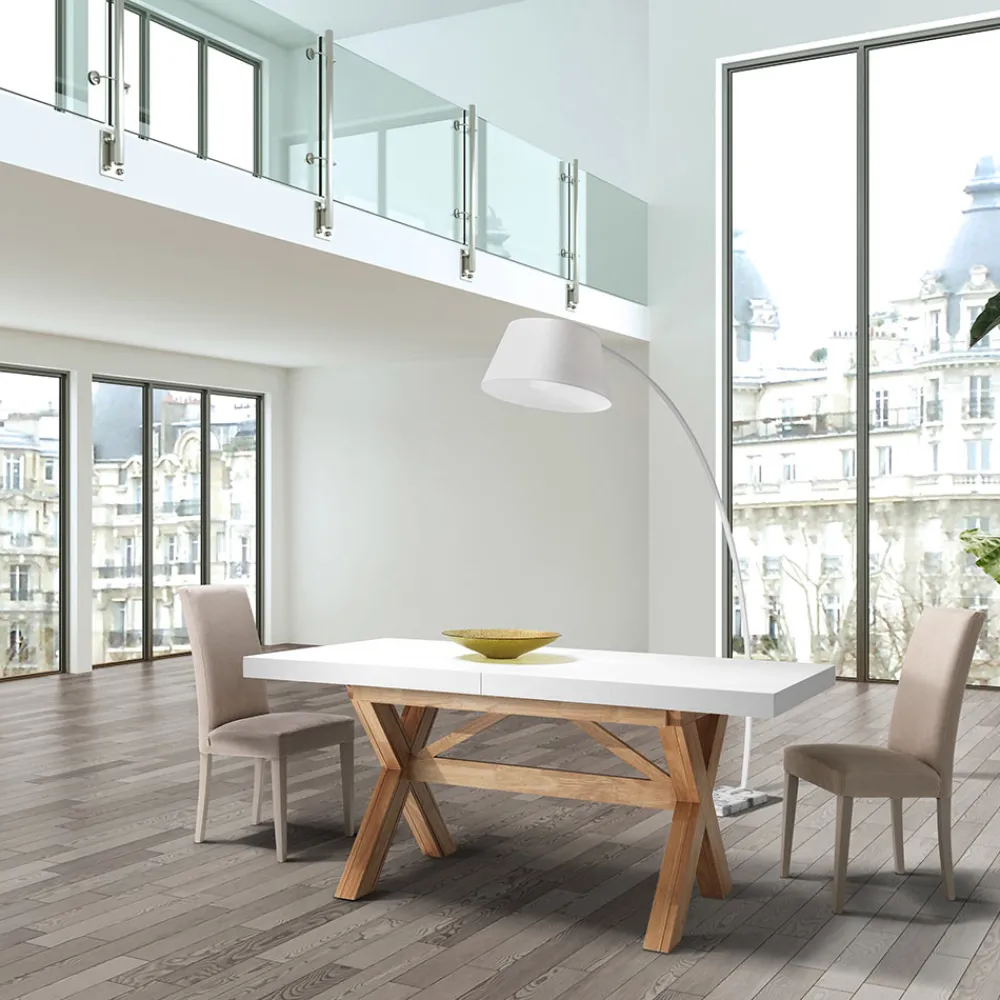 Esstisch aus Massivholz mit offenporig weiß lackierter ausziehbarer Platte und Untergestell in Eichenoptik. Ein imposantes und modernes Design, das sich durch einfache und geradlinige Formen auszeichnet für ein Ergebnis mit hoher Anwendungsvielfalt . Seine funktionale Seite wird durch die 4 Verlängerungen von jeweils 45 cm unter der Platte unterstrichen und hervorgehoben, die eine maximale Länge des Tisches von 360 cm ermöglichen. Diese Eigenschaft macht es perfekt für diejenigen, die Mittag- und Abendessen gerne in Gesellschaft organisieren und daher einen Raum benötigen, der alle ihre Gäste optimal unterbringen kann.
