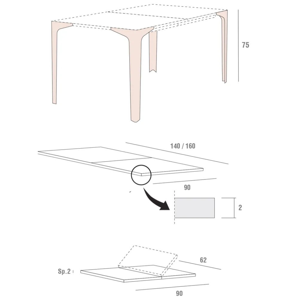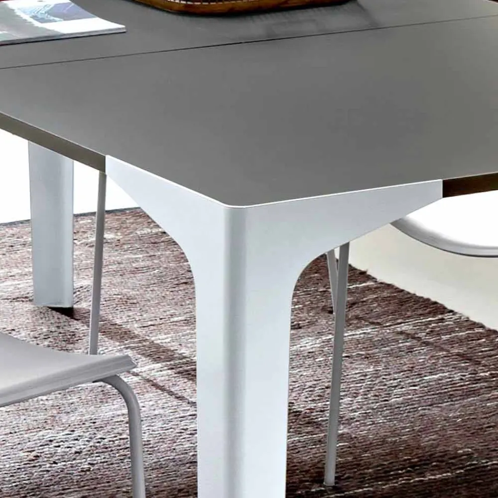 Diese Ergänzung mit einfachen und minimalistischen Linien eignet sich ideal für Umgebungen mit modernem Stil und zeichnet sich durch die Möglichkeit aus, die Tischoberfläche dank einer Verlängerung in der gleichen Farbe wie die Tischplatte auf maximal 222 cm zu verlängern. Dadurch kann eine größere Anzahl von Gästen für wunderbare Mittag- oder Abendessen in Gesellschaft untergebracht werden, wodurch seine Funktionalität und sein Wert erhöht werden.