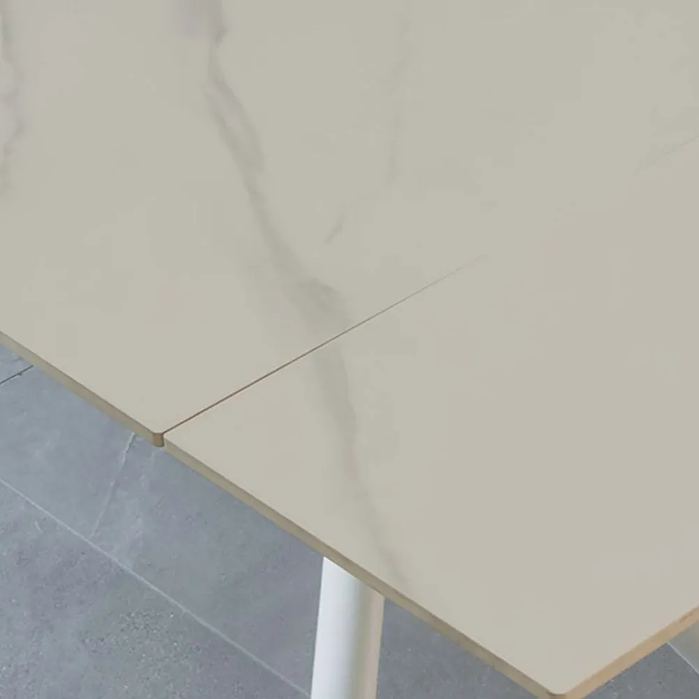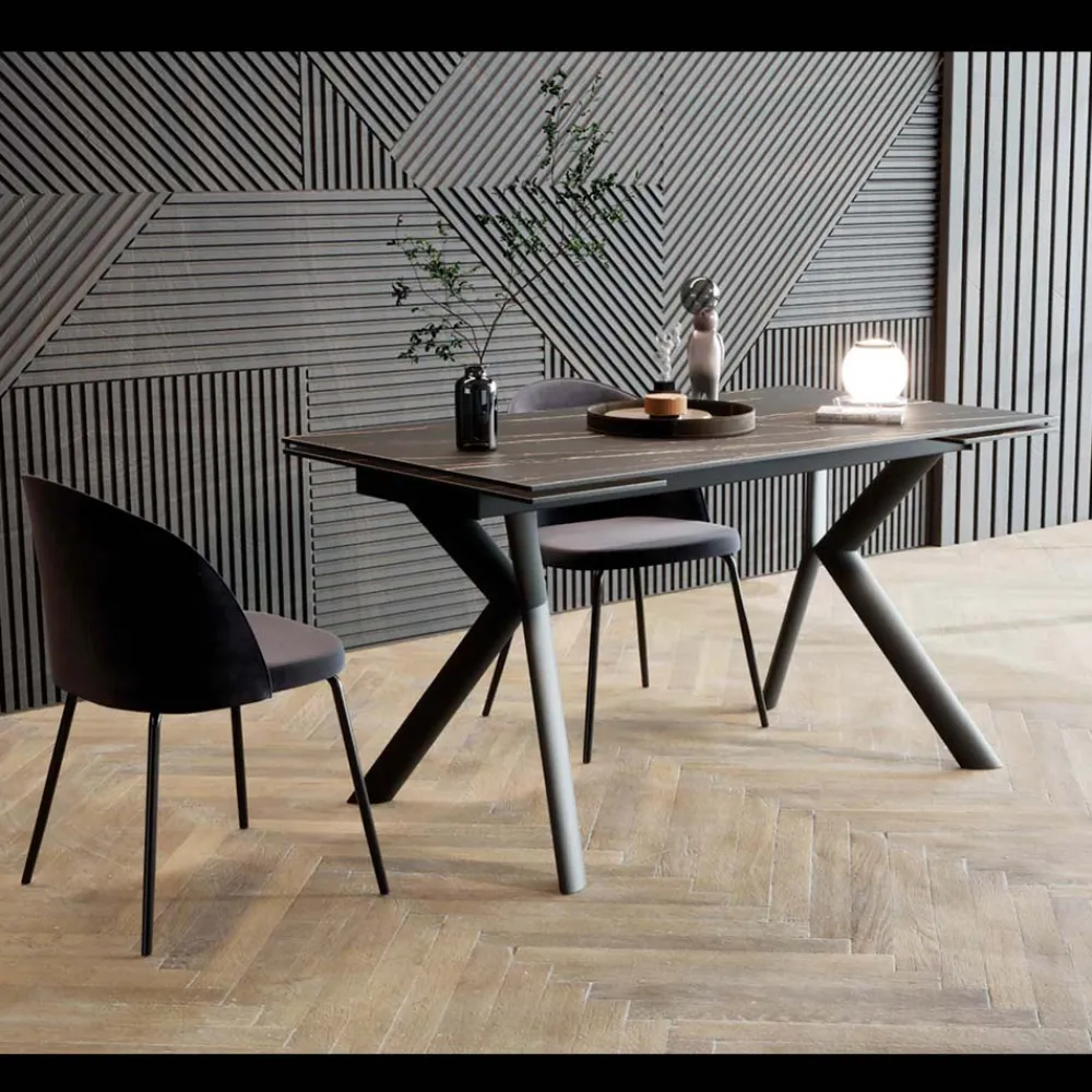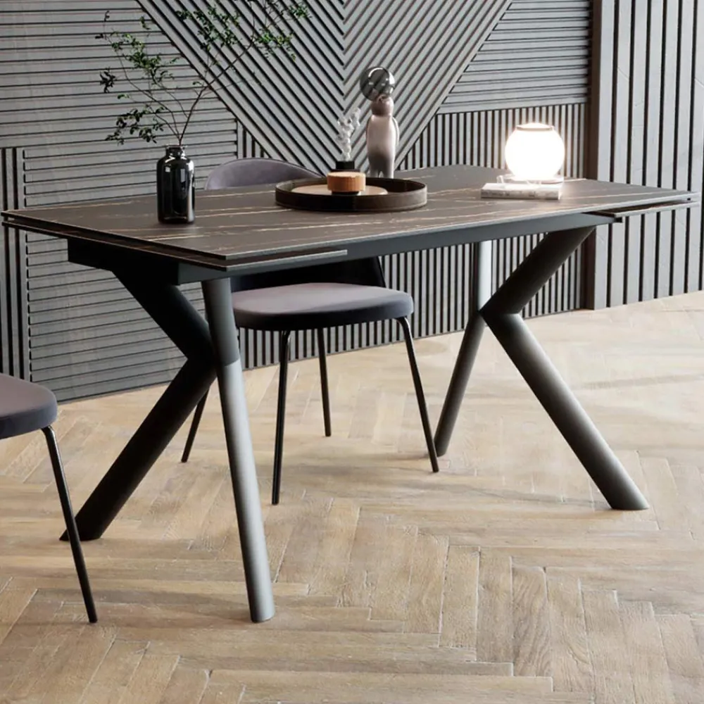 Ausziehbarer Esstisch mit Platte aus Feinsteinzeug und Untergestell aus Metall.