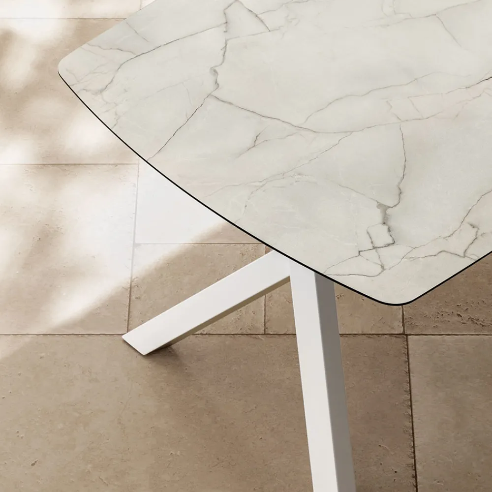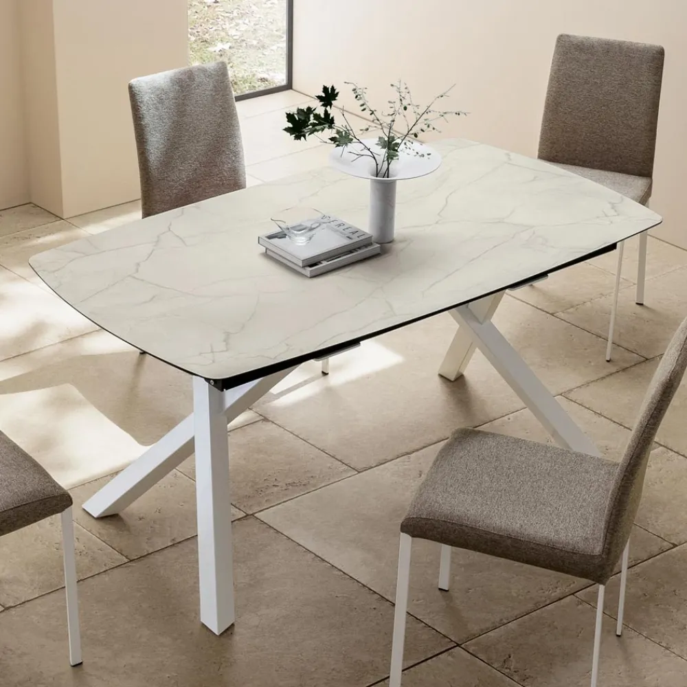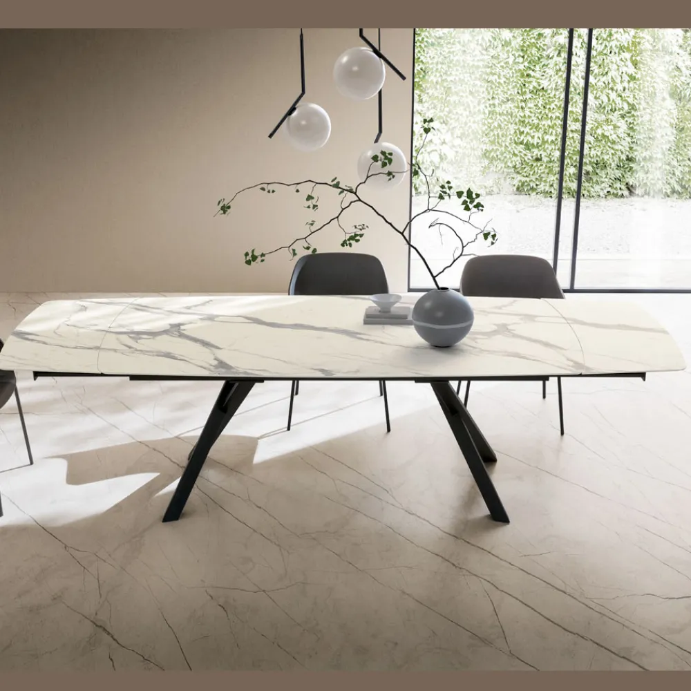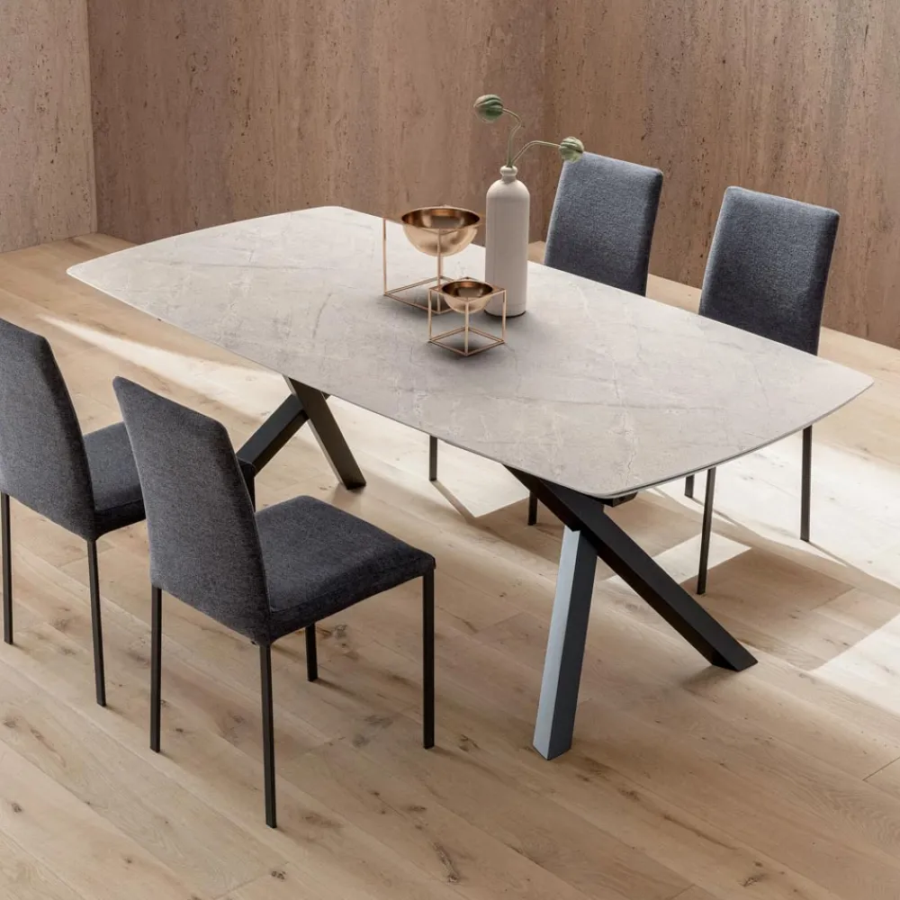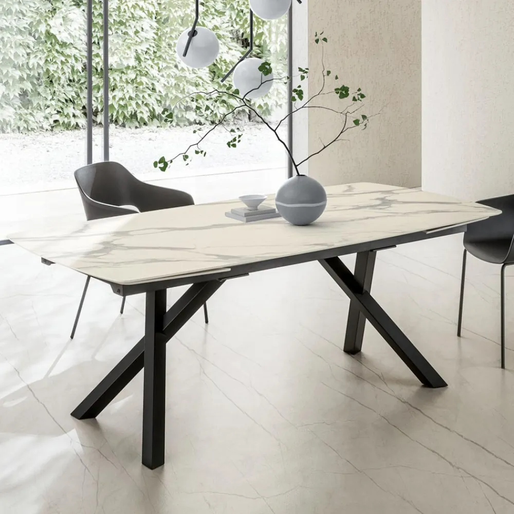 Die lackierte Metallstruktur mit gekreuzten Beinen mit starker optischer Wirkung verleiht Stabilität, Robustheit und architektonischen Stil und macht diesen Tisch perfekt für moderne, elegante und offene Raumumgebungen.