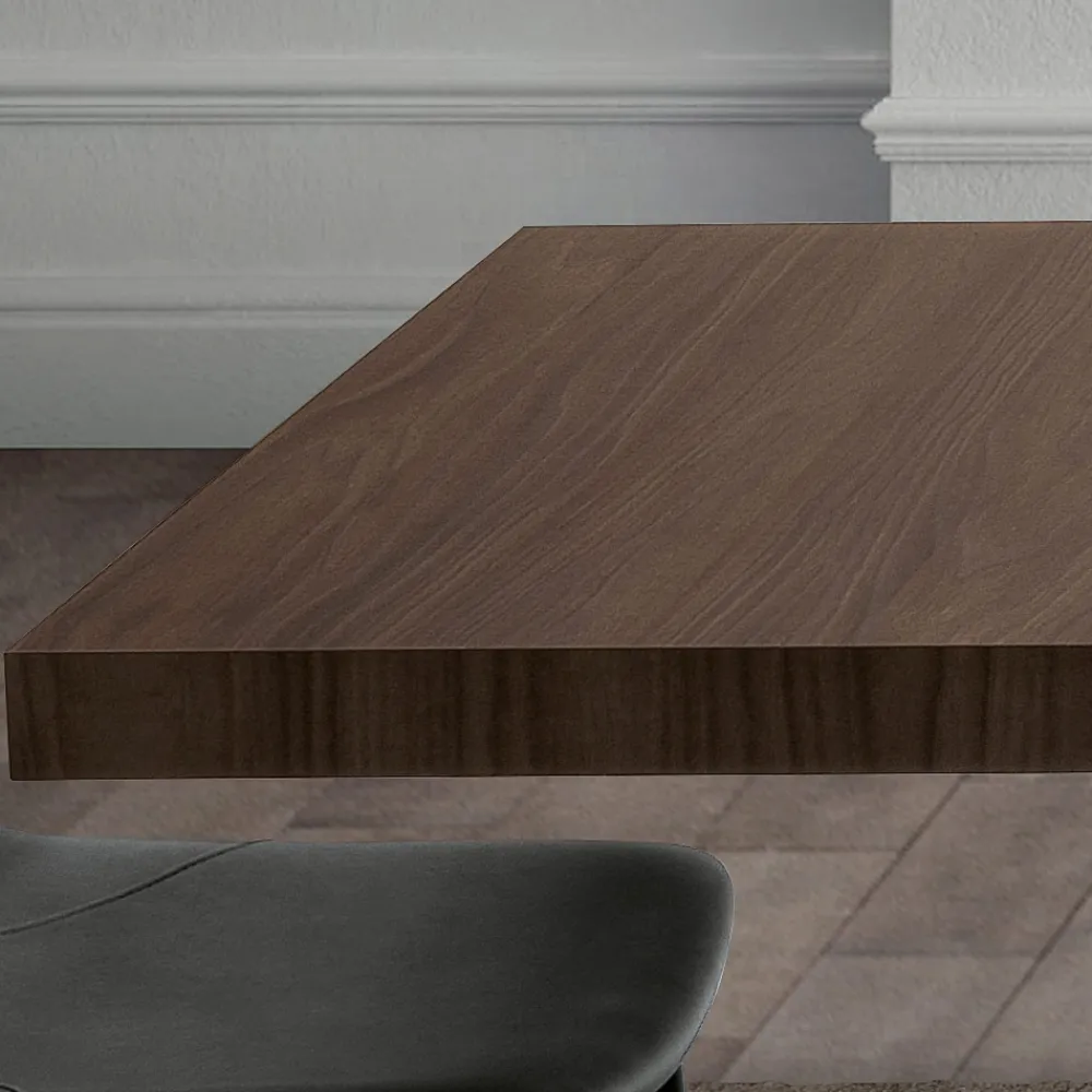 Dieser ausziehbare Tisch verkörpert die Meisterschaft moderner Handwerkskunst. Die Melaminplatte ist reich und warm, ihre natürlichen Maserungen bilden eine faszinierende Landschaft aus Schattierungen und Texturen, die jedes Stück einzigartig machen. Das robuste Erscheinungsbild des Holzes kontrastiert mit der schlanken und definierten Silhouette des Untergestells und bietet einen Treffpunkt zwischen Natürlichkeit und Industriedesign.