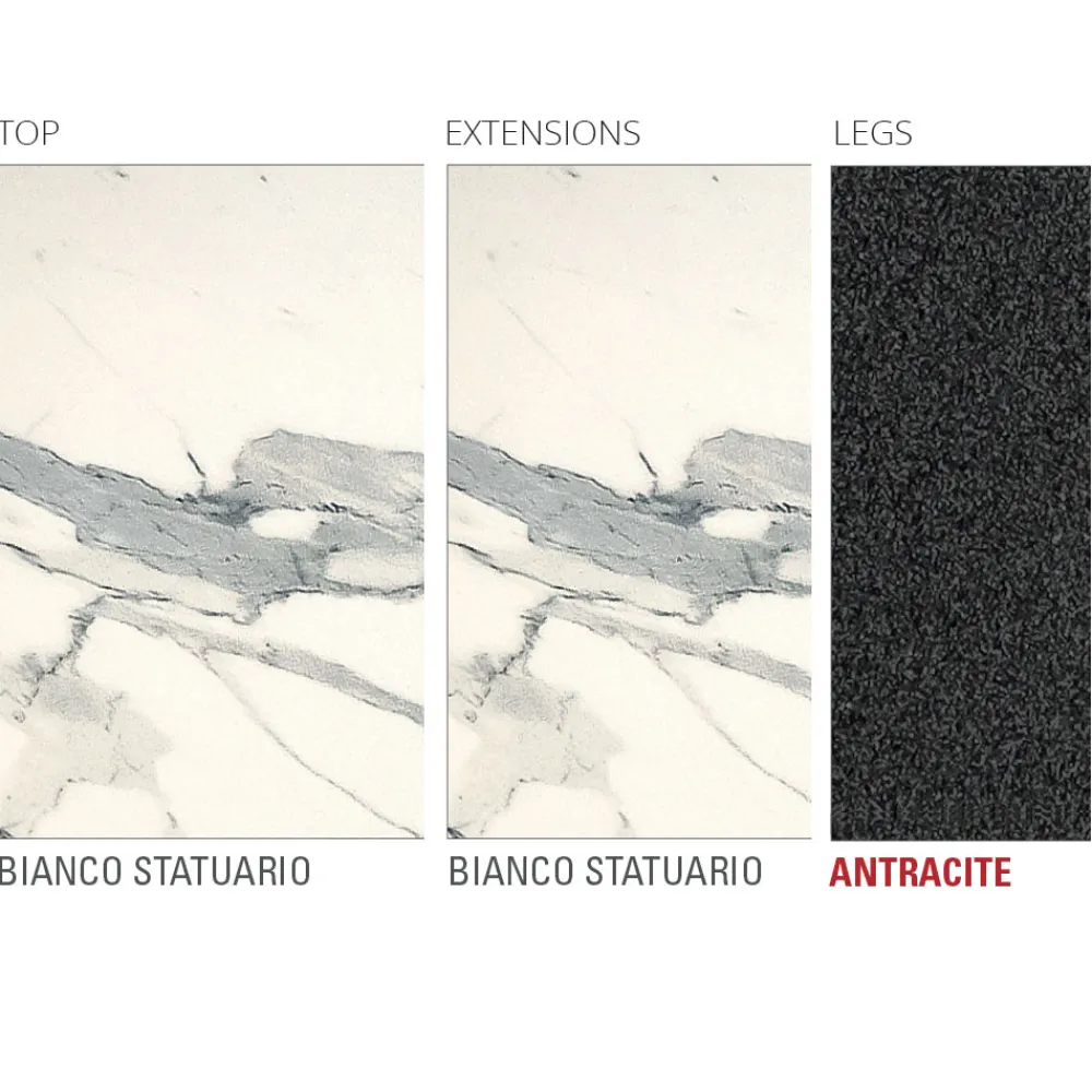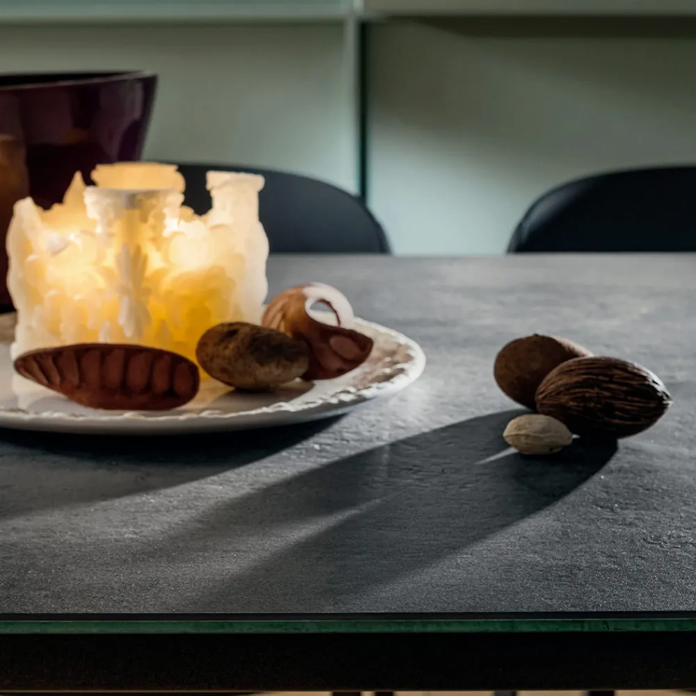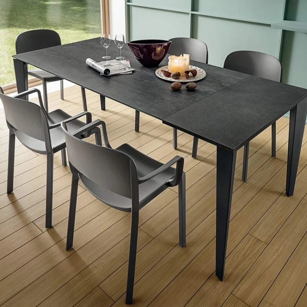 In Italien hergestellter Esstisch mit Platte aus Laminat (Feinsteinzeug) mit Glasträger und Beinen aus epoxidlackiertem Aluminium in Anthrazit. Seine Besonderheit wird durch die Laminam-Platte repräsentiert, eine revolutionäre Keramikoberfläche, die aus einer Feinsteinzeugmischung hergestellt wird, die es Ihnen ermöglicht, eine Platte zu erhalten, die gegen Lösungsmittel, Desinfektionsmittel und Reinigungsmittel sowie gegen Kratzer und tiefen Abrieb beständig ist. Zudem ist es besonders einfach und schnell zu reinigen, wobei es seine besonderen Eigenschaften stets unverändert beibehält. Sein Design zeichnet sich durch einfache Linien aus, die durch äußerst elegante Texturen und Oberflächen bereichert werden, die es zu einer idealen Lösung machen, um Ihre Räume mit Stil und Persönlichkeit zu vervollständigen und Funktionalität und eine exklusive Ästhetik in einem einzigen Artikel zu erhalten. Zusammen mit der fesselnden und raffinierten Ästhetik finden wir eine starke funktionale Seite, die durch die ausziehbare Platte dank der passenden Verlängerungen unterstrichen wird, die die Möglichkeit bietet, eine größere Anzahl von Gästen zu empfangen, die zurückkehren, um nach dem Schließen einen kleineren Raum zu belegen.