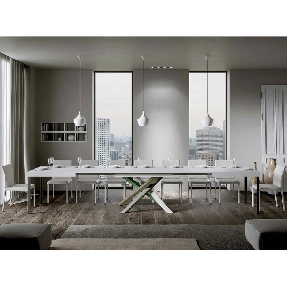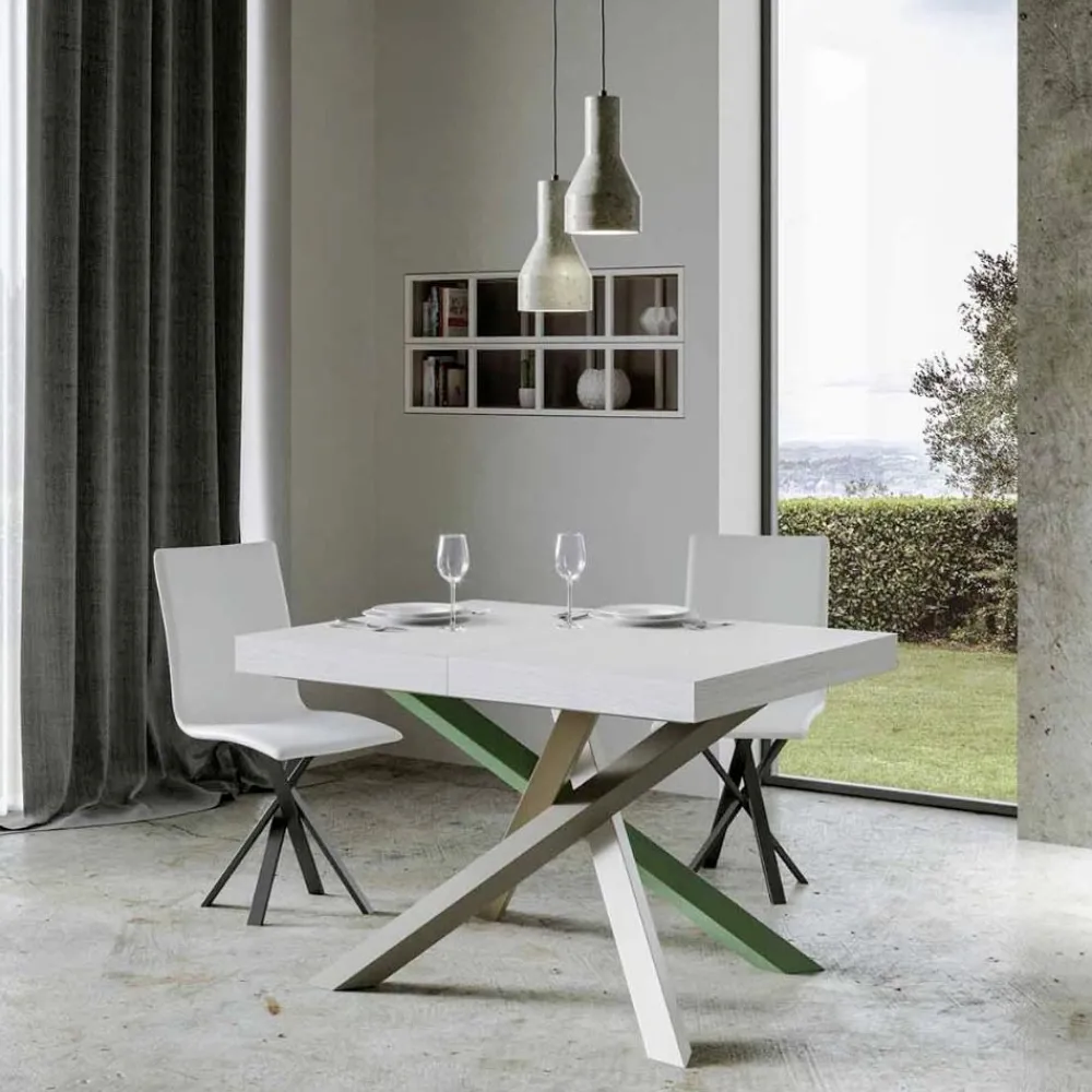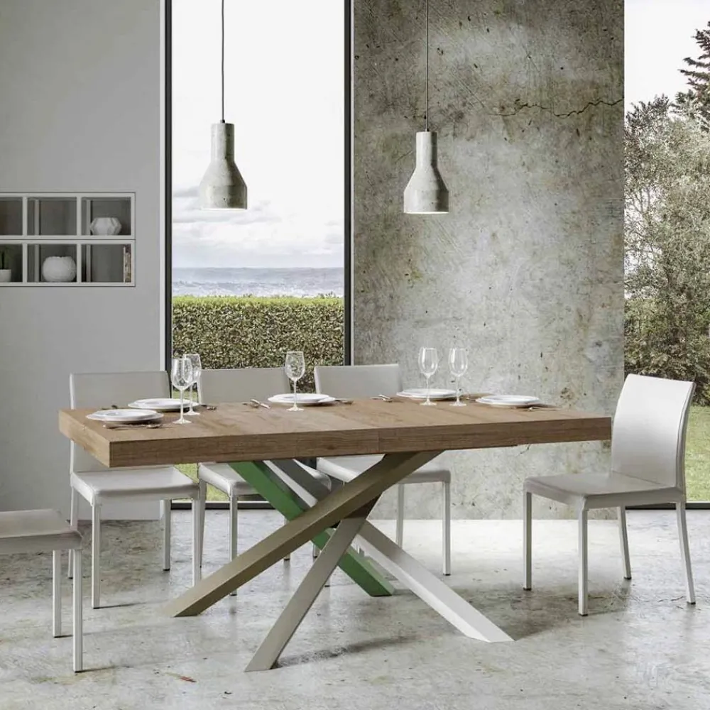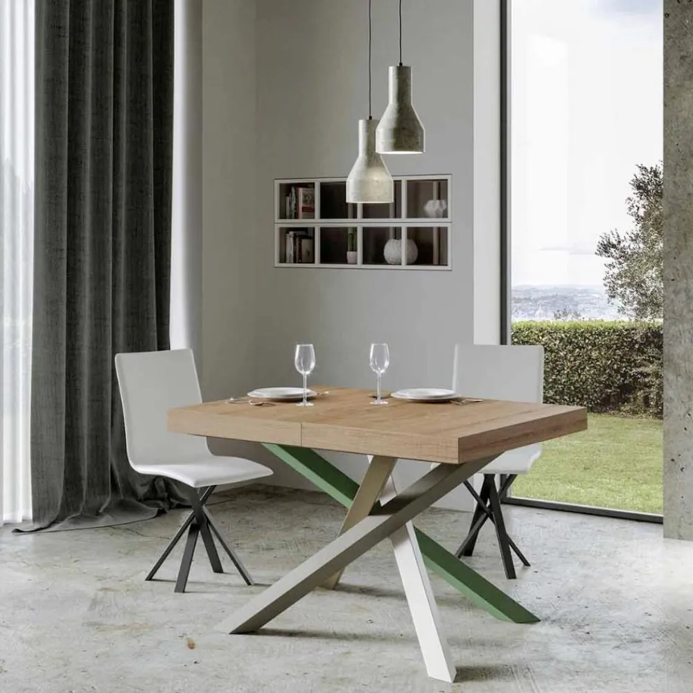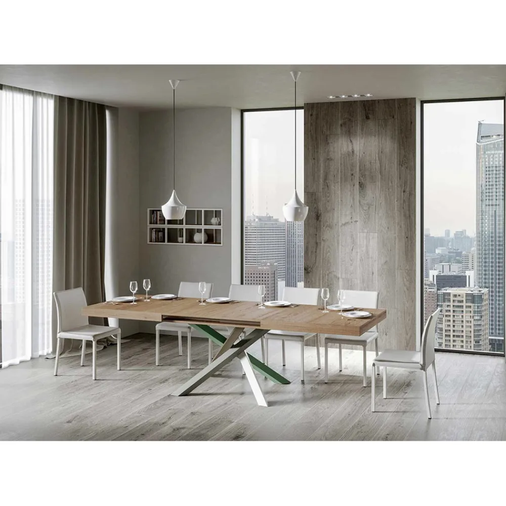 Entdecke den ausziehbaren Tisch, ein Meisterwerk des modernen Designs, das sich durch seine einzigartige Silhouette und vielseitige Funktionalität auszeichnet. Die Holzplatte verleiht dem Raum Helligkeit und bietet eine glatte und robuste Oberfläche, die zum täglichen Gebrauch einlädt. Der Tischfuß ist ein wahres geometrisches Spektakel, mit gekreuzten Beinen, die sich in einem Farbenspiel verflechten. Die vorgeschlagene Kombination ist: Fuß 1: Reinweiß (RAL 9010). Schenkel 2: Moosgrau (RAL 7003). Schenkel 3: Olivgrau (RAL 7002). Schenkel 4: Resedagrün (RAL 6011). Die RAL-Farben sind opak. Diese Kombination verleiht dem Design nicht nur einen Hauch von Vitalität, sondern sorgt auch für Stabilität und Festigkeit. Der Mechanismus zur Tischverlängerung ist einfach wie technisch und ermöglicht es, dieses elegante Möbelstück von einem praktischen Tisch für vier Personen in einen gemütlichen Bereich für Abendessen und größere Zusammenkünfte zu verwandeln.